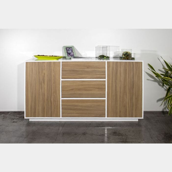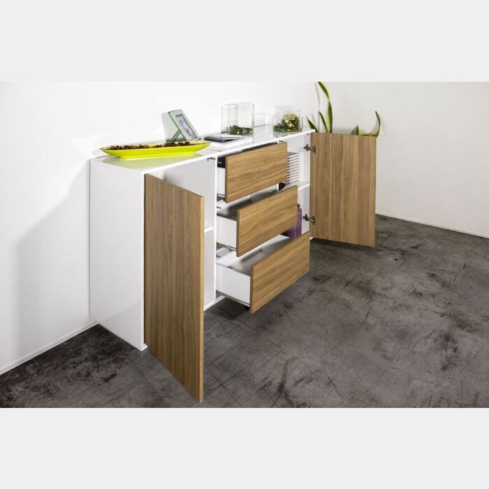 -Credenza di design moderna bicolore 2 ante e 3 cassetti. La finitura noce caracalla abbraccia e si fonde al bianco laccato lucido creando un mobilio dall'animo moderno e raffinato ma nel contesto caldo e ardente, indicata per soluzione contemporanee e dal carattere minimale.