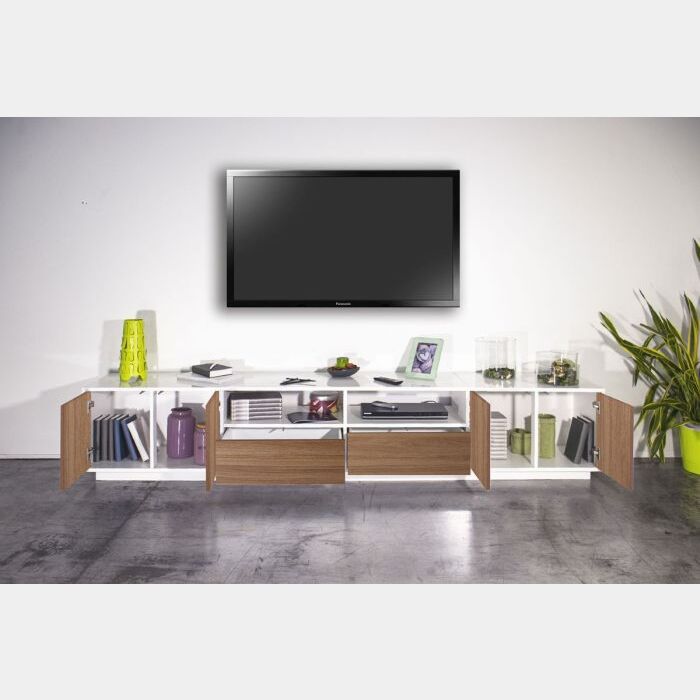 Il mobile porta tv presenta un piano d'appoggio per una lunghezza complessiva di 260 cm, misura adeguata anche per una televisione dalle grandi dimensioni. Sono inoltre presenti due vani aperti nella parte inferiore al top del mobile, utili e funzionali per l'inserimento di un decoder o di ulteriori dispositivi elettronici. L'elemento per di più è costituito da due cassetti con guide metalliche per uno scorrimento fluido e pratico, oltre a due sportelli contenitivi con apertura ad anta battente.