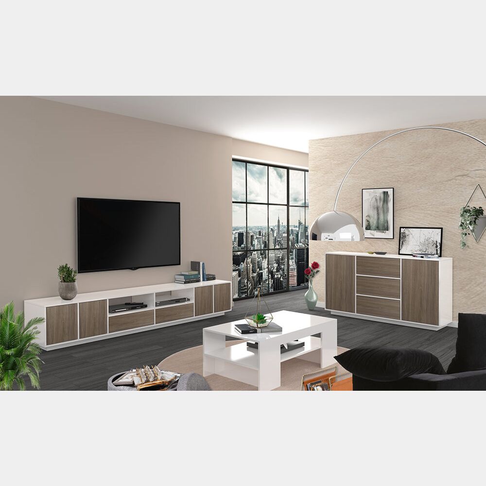 Salotto con madia e porta TV finitura bianco lucido e noce caracalla