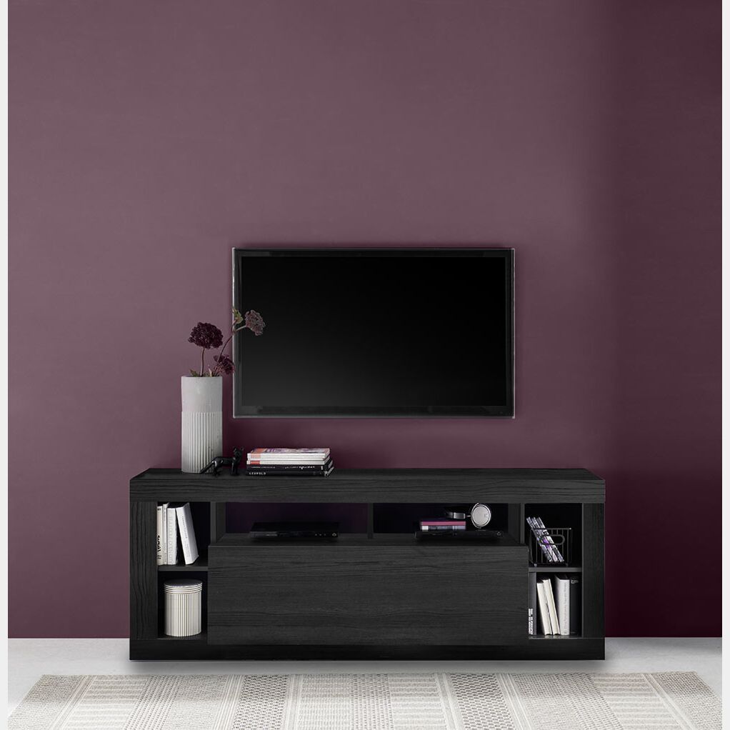 Pratico Porta TV, finitura Nero frassinato, con 1 ribalta, Made in Italy. Il porta TV si adatta facilmente a tutti i tipi di soggiorni grazie al suo look contemporaneo
