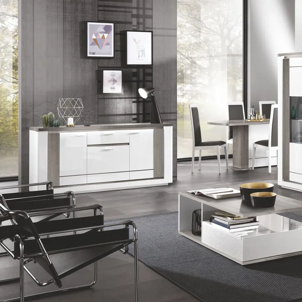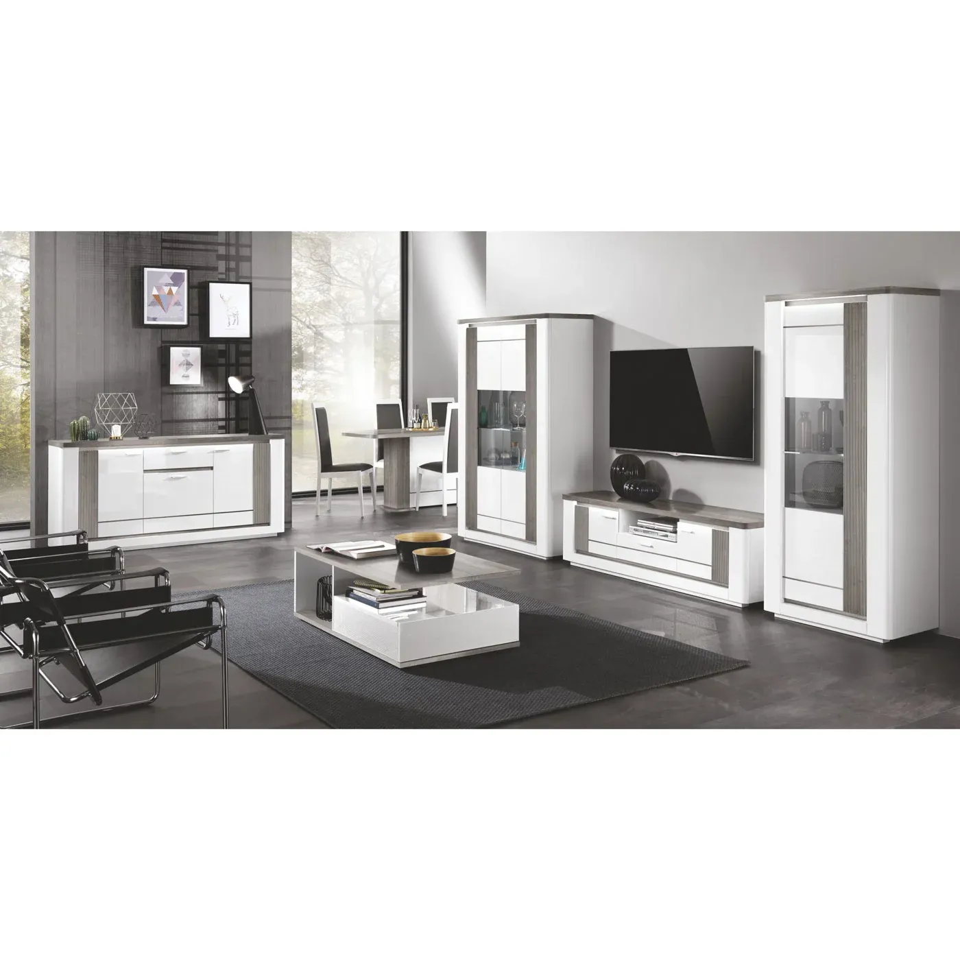 Soggiorno Rovere Adamello e Bianco laccato lucido in promozione. E' costituito da una madia, da un tavolo, da una vetrina con due ante, da un porta Tv, da una vetrina con un'anta, da un tavolino per una zona living.