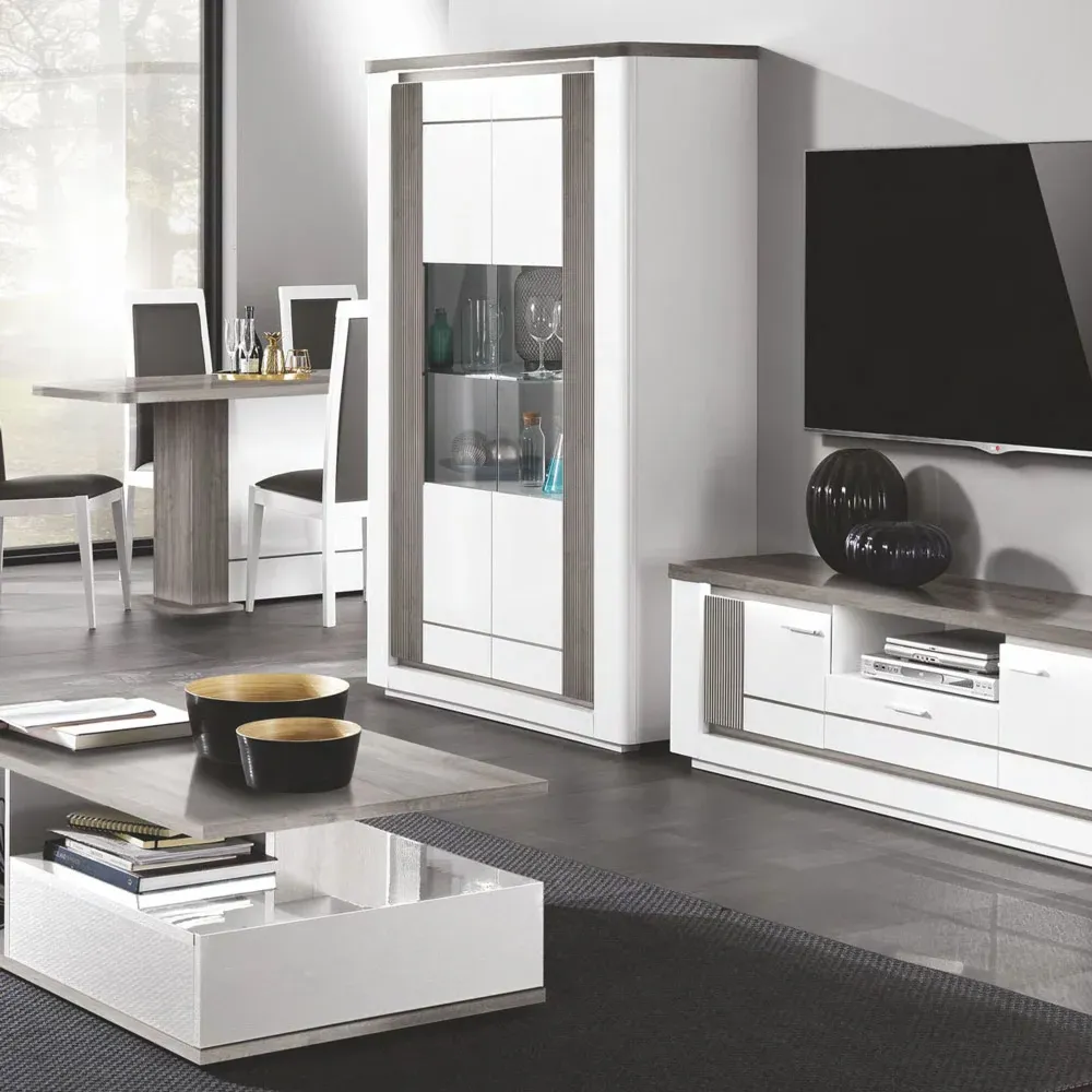 Soggiorno in finitura Rovere adamello e Bianco laccato lucido composto da una vetrina con due ante, da un tavolo, da uno specchio, da una madia.