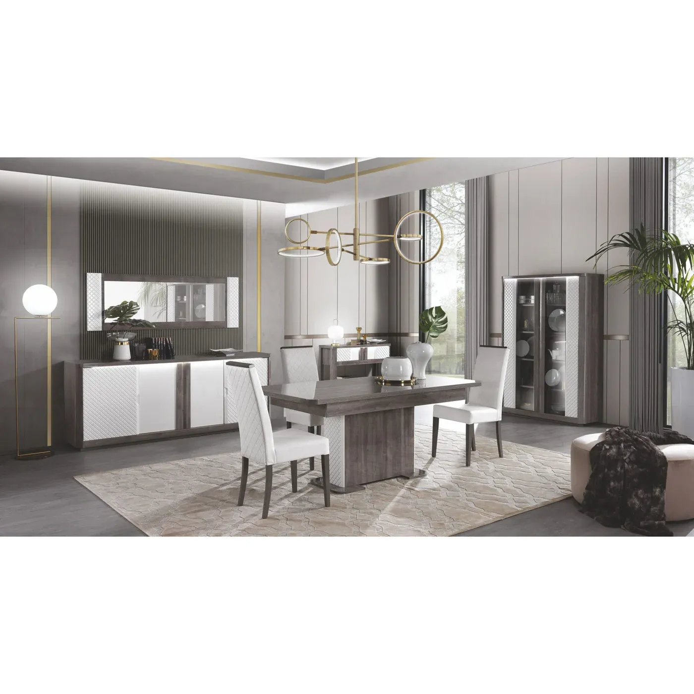 Soggiorno economico in finitura Rovere e Bianco laccato lucido. E' composta da un tavolo, da una comodissima vetrina e da uno specchio molto moderno.