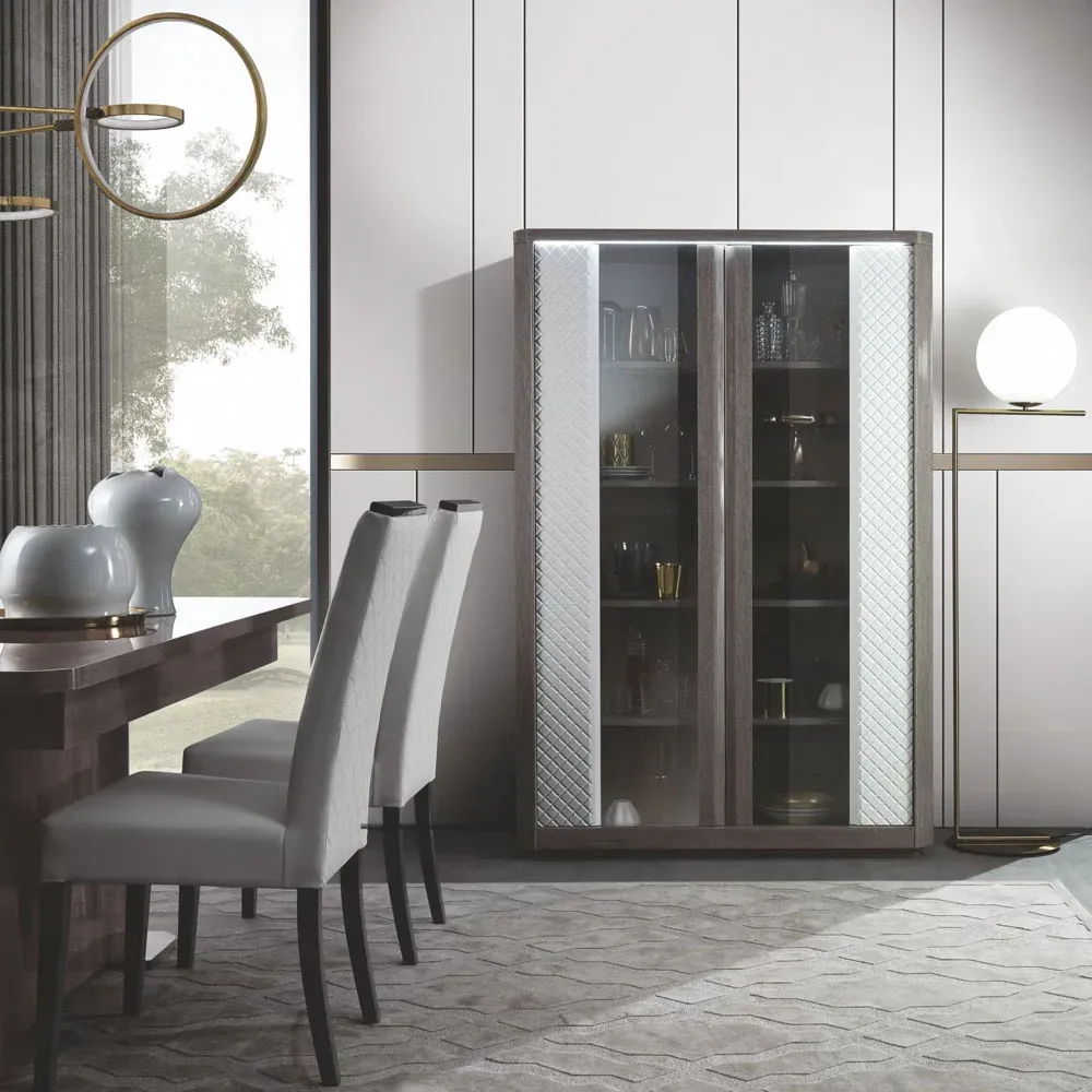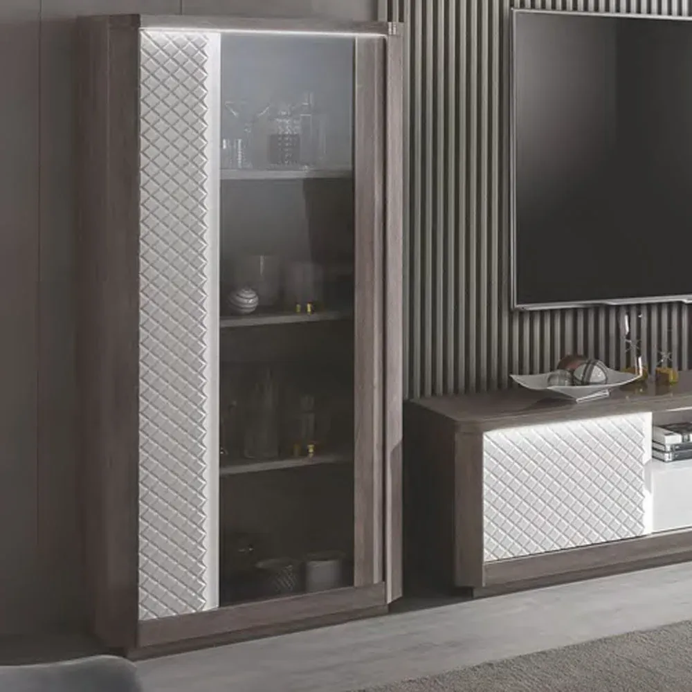 -Una vetrina che si rivela sin da subito molto spaziosa per inserire nei vari ripiani collezioni personali, souvenir, stoviglie. E' cosituita da un anta battente che permette un facile accesso. Il suo design moderno si adatta a più ambienti o in una cucina o in un salotto.