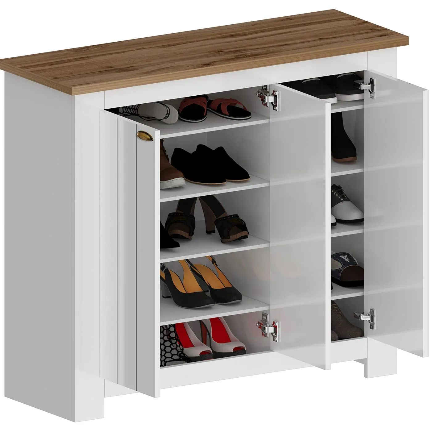Dotato di 3 ante battenti, questo mobile offre un ampio spazio interno con 8 generosi ripiani, in grado di ospitare fino a 30 paia di scarpe. Il materiale utilizzato per la fabbricazione, un legno nobilitato di alta qualità, garantisce stabilità e solidità.
