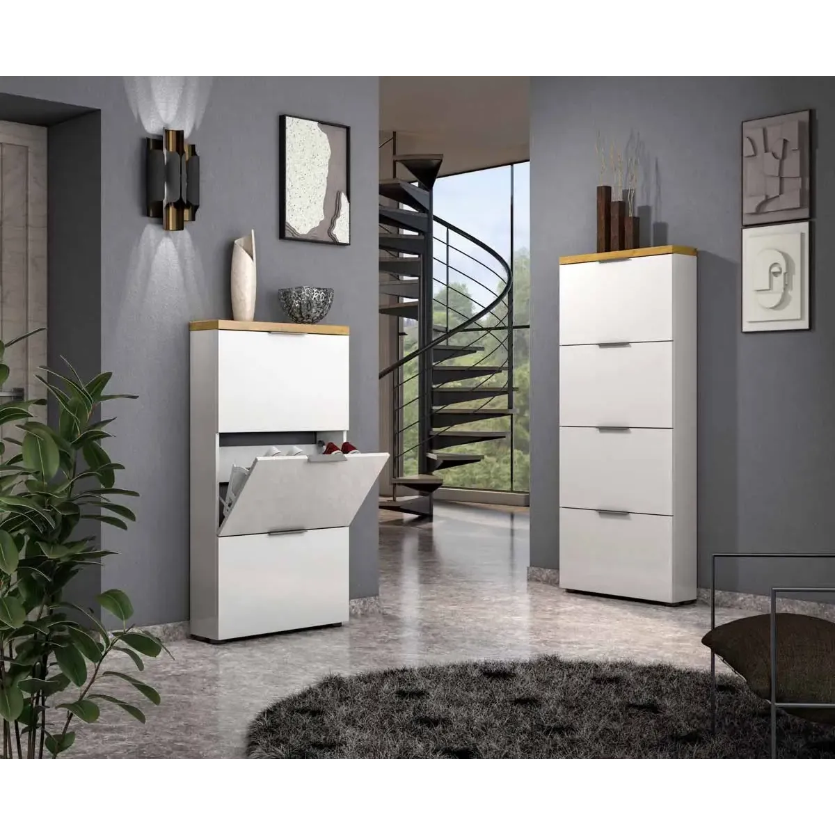 Scarpiera 3 ribalte, Bianco lucido e Rovere chiaro