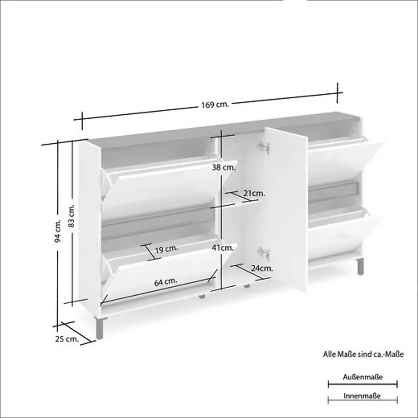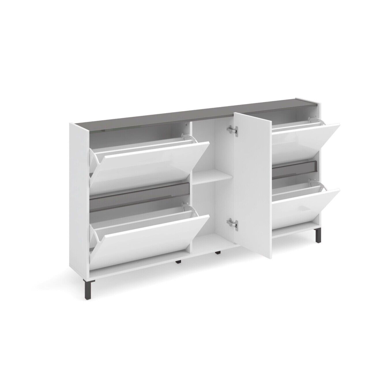 La scarpiera moderna finitura Bianco lucido con dettagli di colore grigio scuro è dotata di 4 ante a ribalta dove si possono inserire fino a 16 paia di scarpe e da un'antina battente dove si può stivare ad esempio il materiale per la pulizia delle scarpe.