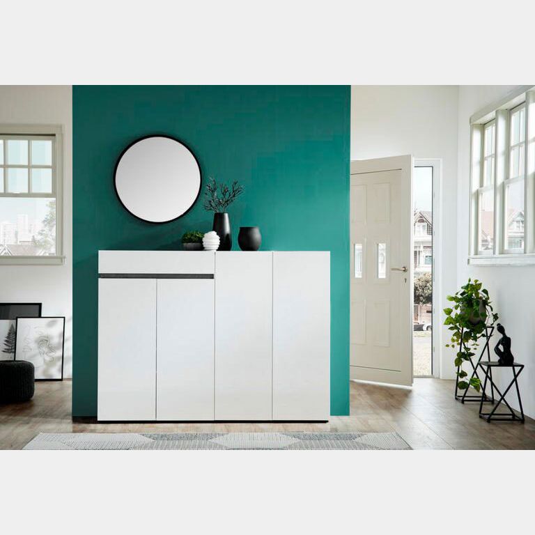Le linee definite della scarpiera incontrano la luminosa finitura Bianco lucido che contrasta l'intensa tonalità grigia presente nel top e sulla gola delle maniglie. L'effetto finale è un mobile con grande personalità che arreda l'ambiente con carattere.