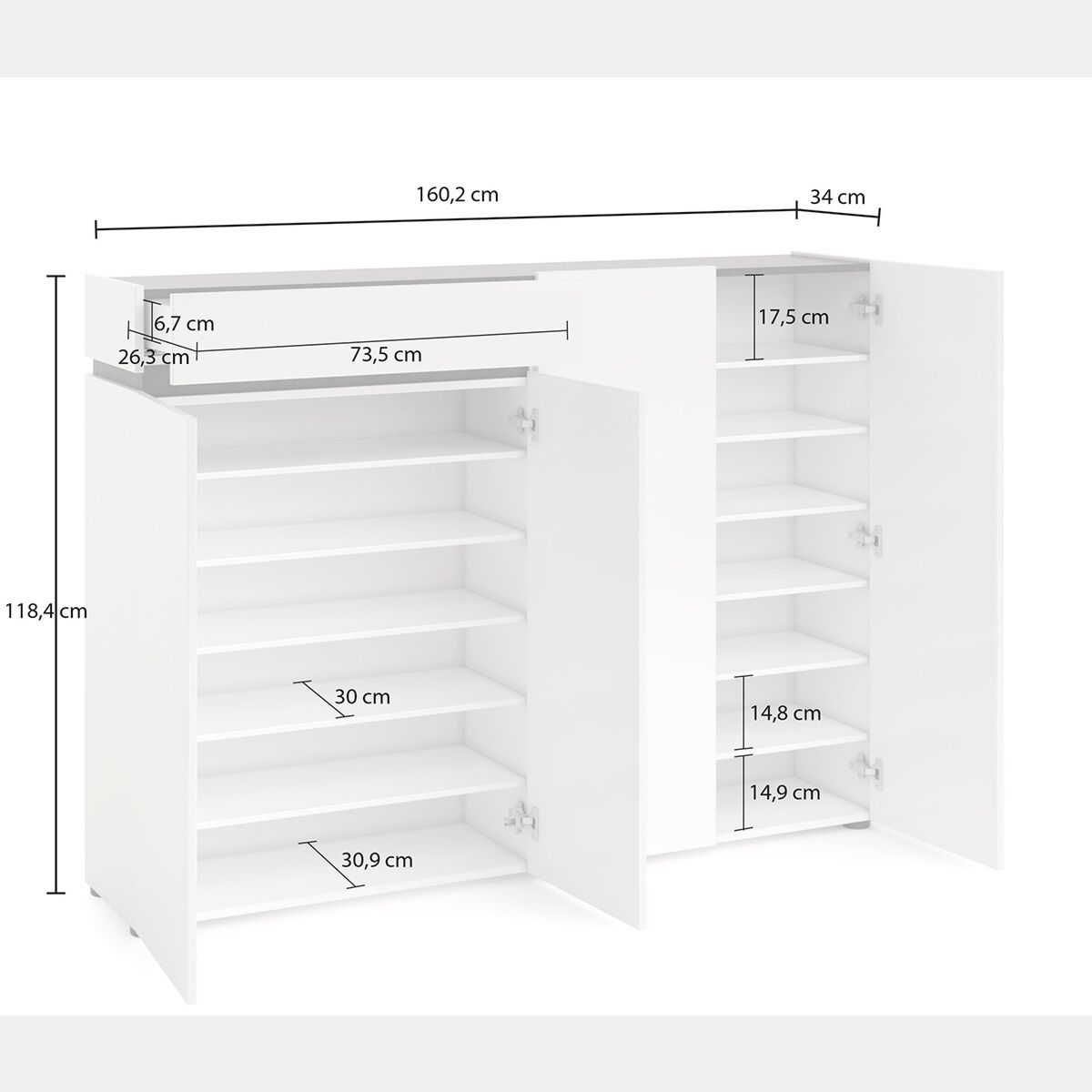 La scarpiera presenta quattro ante: nel vano di sinistra sono presenti cinque ripiani ed un cassetto superiore, utile a posizionare oggetti necessari per la pulizia delle scarpe, mentre nel vano di destra vi sono sei ripiani. Questa suddivisione interna dello spazio assicura un'ampia capienza.