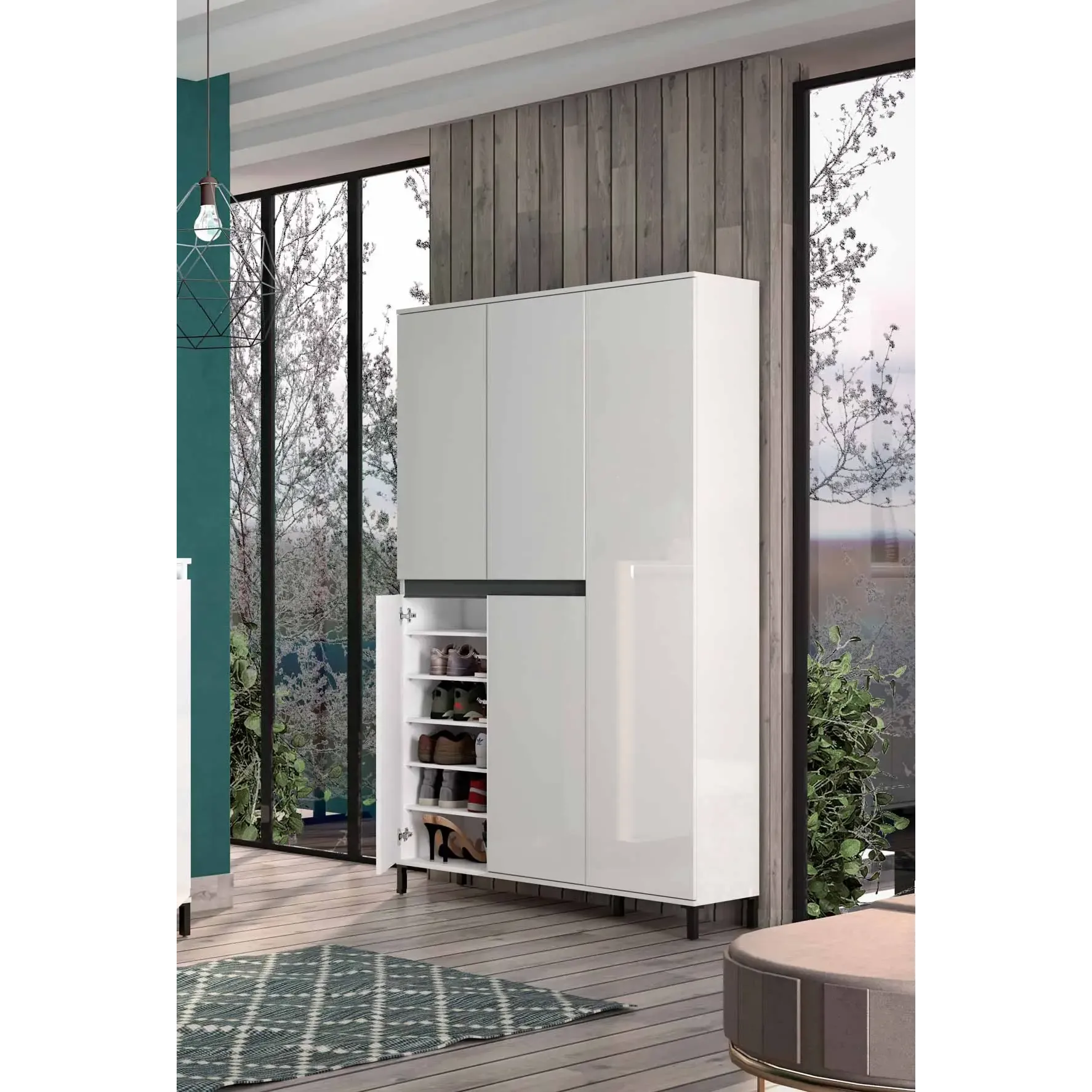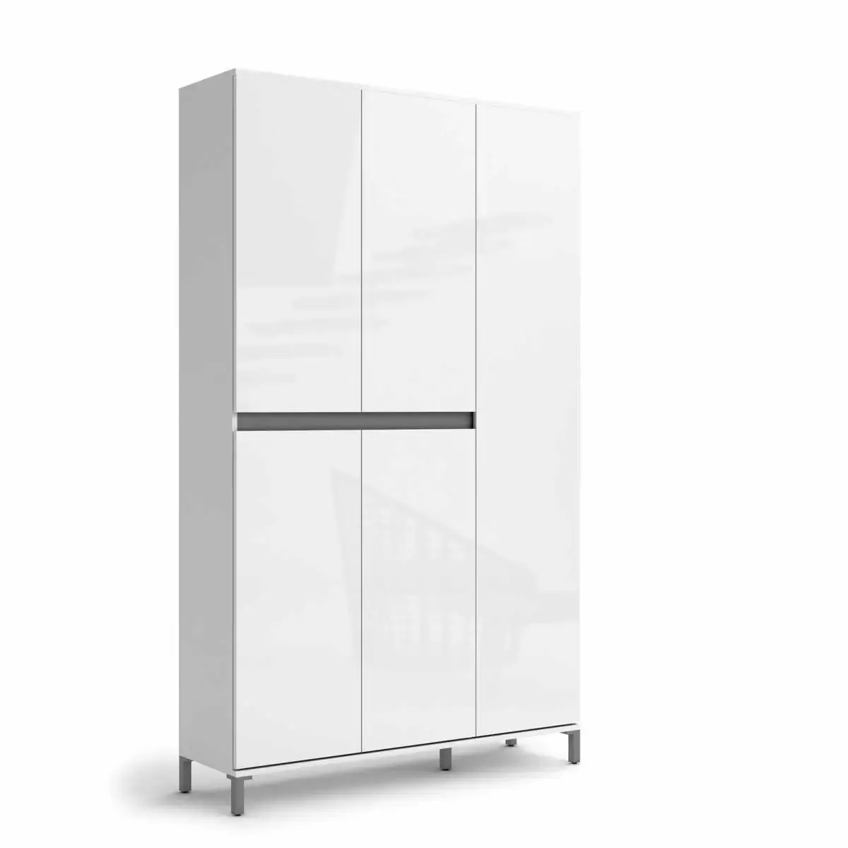 Moderna e funzionale scarpiera alta Bianca lucida a 5 ante con piedini, perfetta per arredare ambienti con spazi ridotti con eleganza e stile.