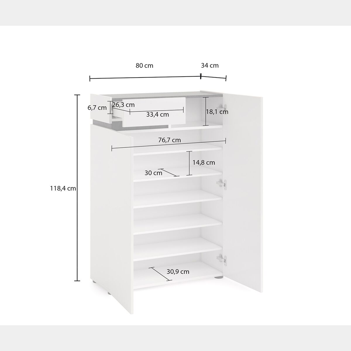 La scarpiera presenta due anta con sei ripiani, il primo viene affiancato da un cassetto, utile a posizionare oggetti necessari per la pulizia delle scarpe. Le dimensioni della scarpiera assicurano una totale adattabilità anche ad ambienti ristretti, infatti le sua profondità non supera i 35 cm.