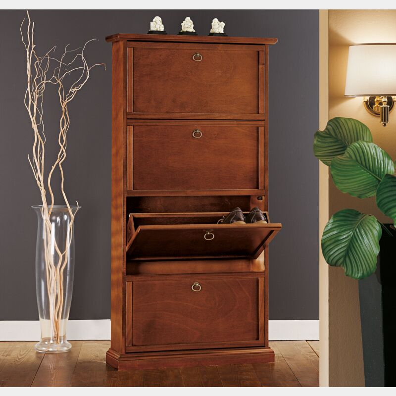 Capiente scarpiera singola colonna in noce arte povera che può contenere fino a 12 paia di scarpe divise in 4 ribalte. Completa di maniglie