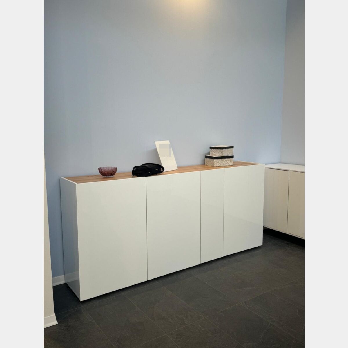 La spaziosa Madia moderna a 4 ante Bianca lucida con Top Rovere è dotata di 4 ante e 6 ripiani, ha una larghezza di 203 cm e si adatta a un ambiente moderno e minimal.