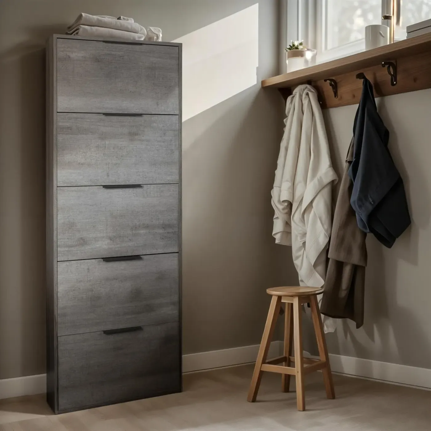 Scarpiera salvaspazio, colore cemento, 5 ante a ribalta, made in Italy