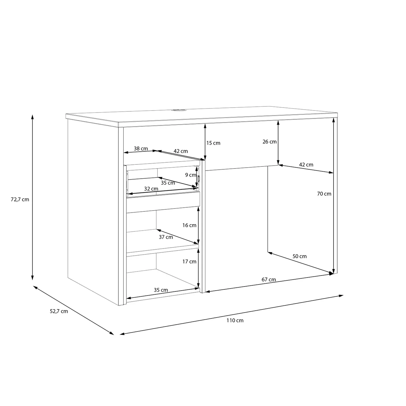 La scarivania, dotata di un modulo cassettiera posizionabile a destra o a sinistra, composto da un cassetto e un'anta con un ripiano interno offre una notevole capienza per documenti, libri e tutto il necessario durante le ore di studio.