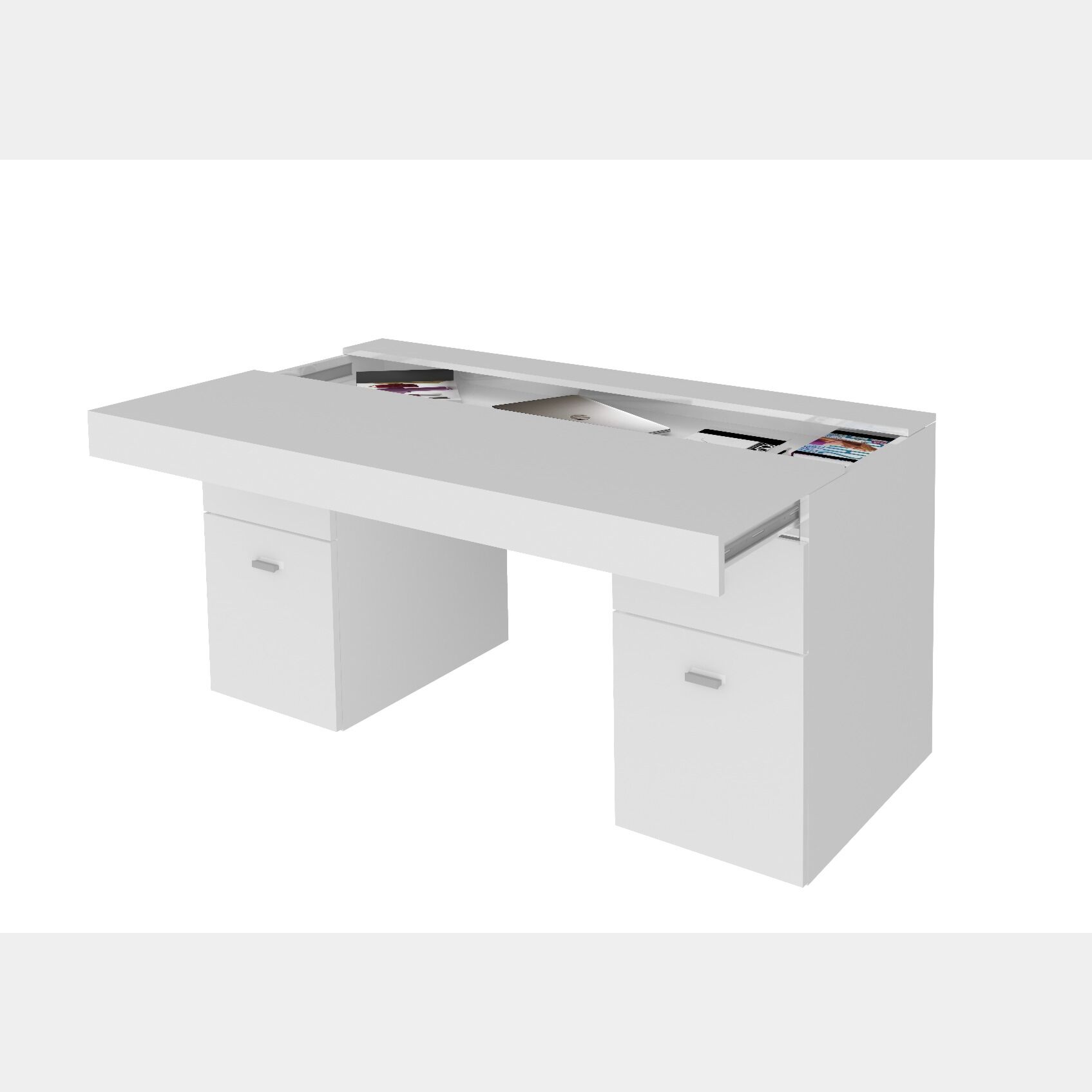 Scrivania dal design moderno e funzionale, perfetta per la vostra zona studio o per l'ufficio. La scrivania è inoltre dotata di un pratico piano scorrevole con cassetto interno. Il piano della scrivania è colore larice bianco, il resto invece è bianco lucido.