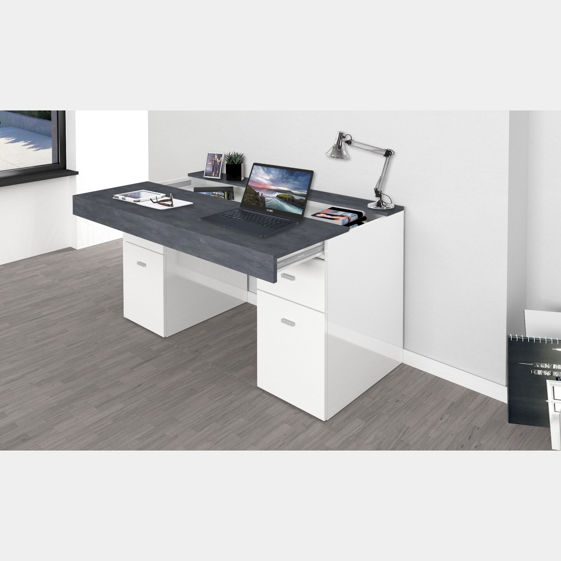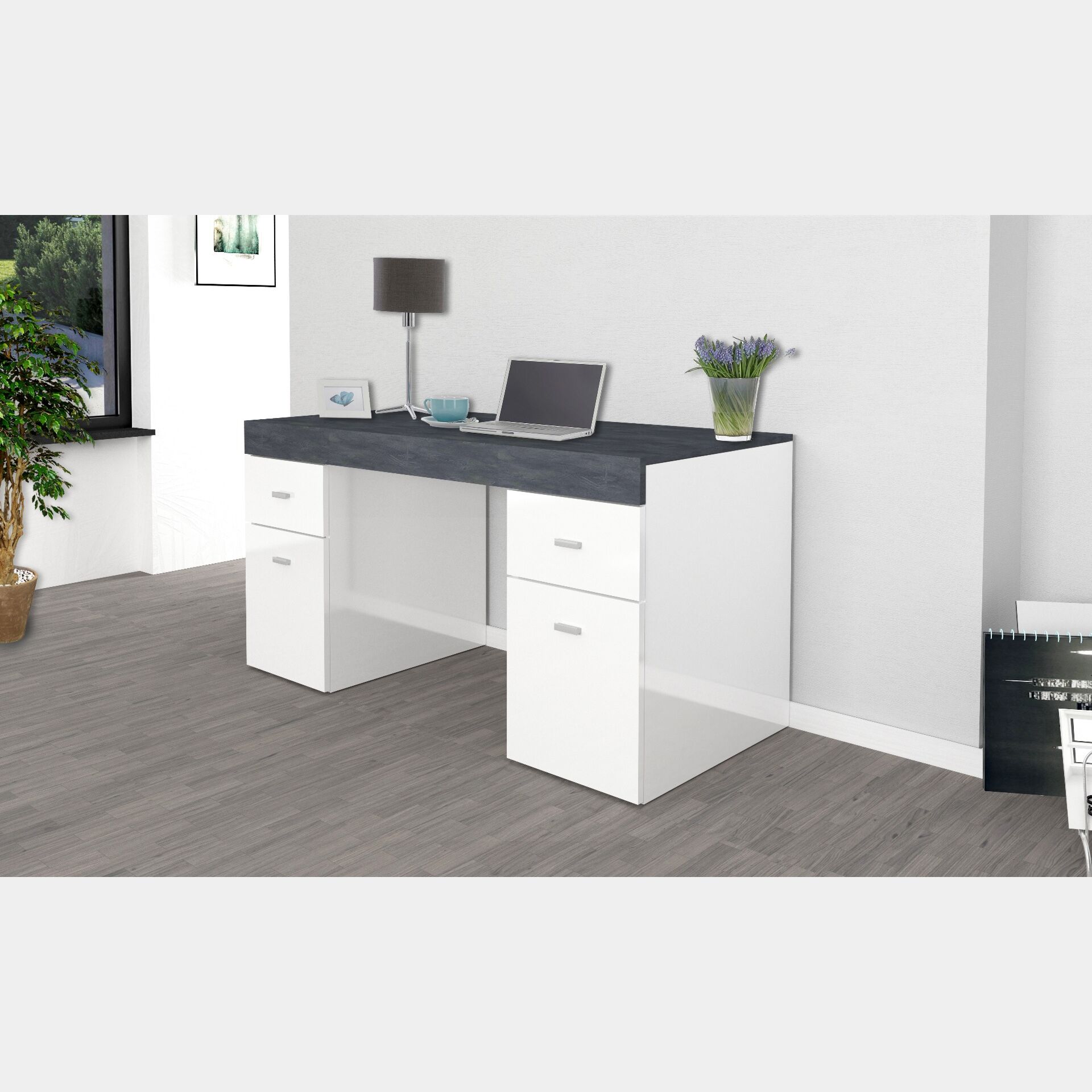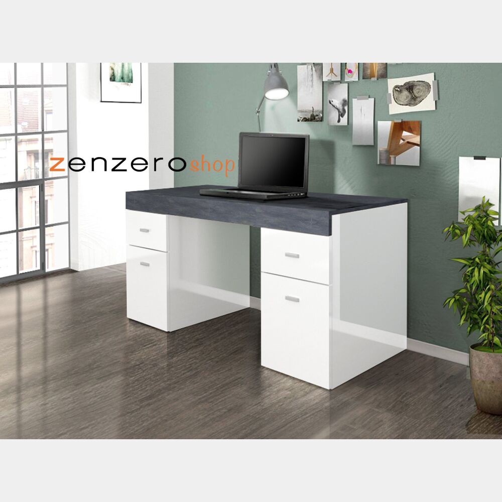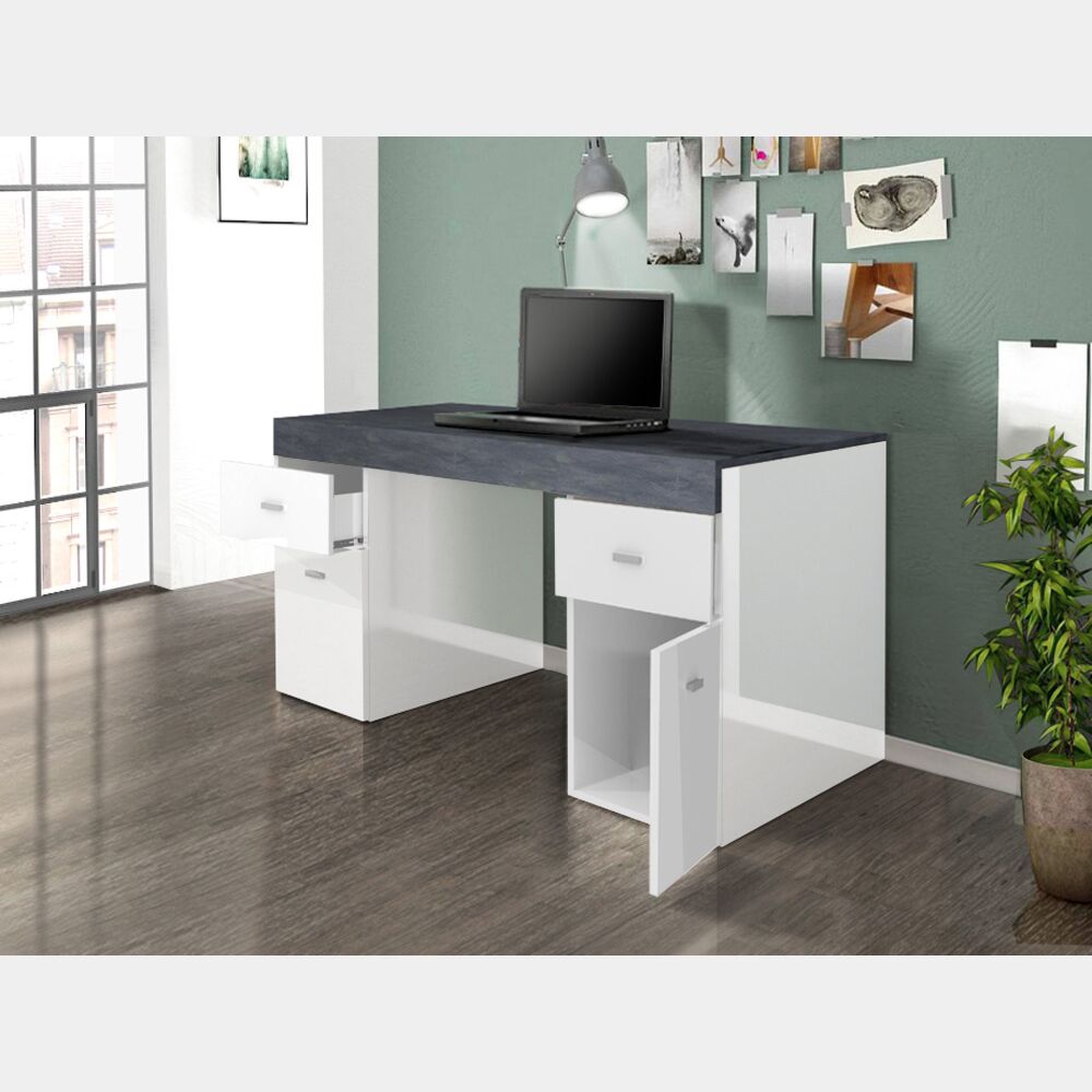 Pratica Scrivania da ufficio in finitura bianco lucido e ardesia, 2 ante e 2 cassetti, made in Italy.