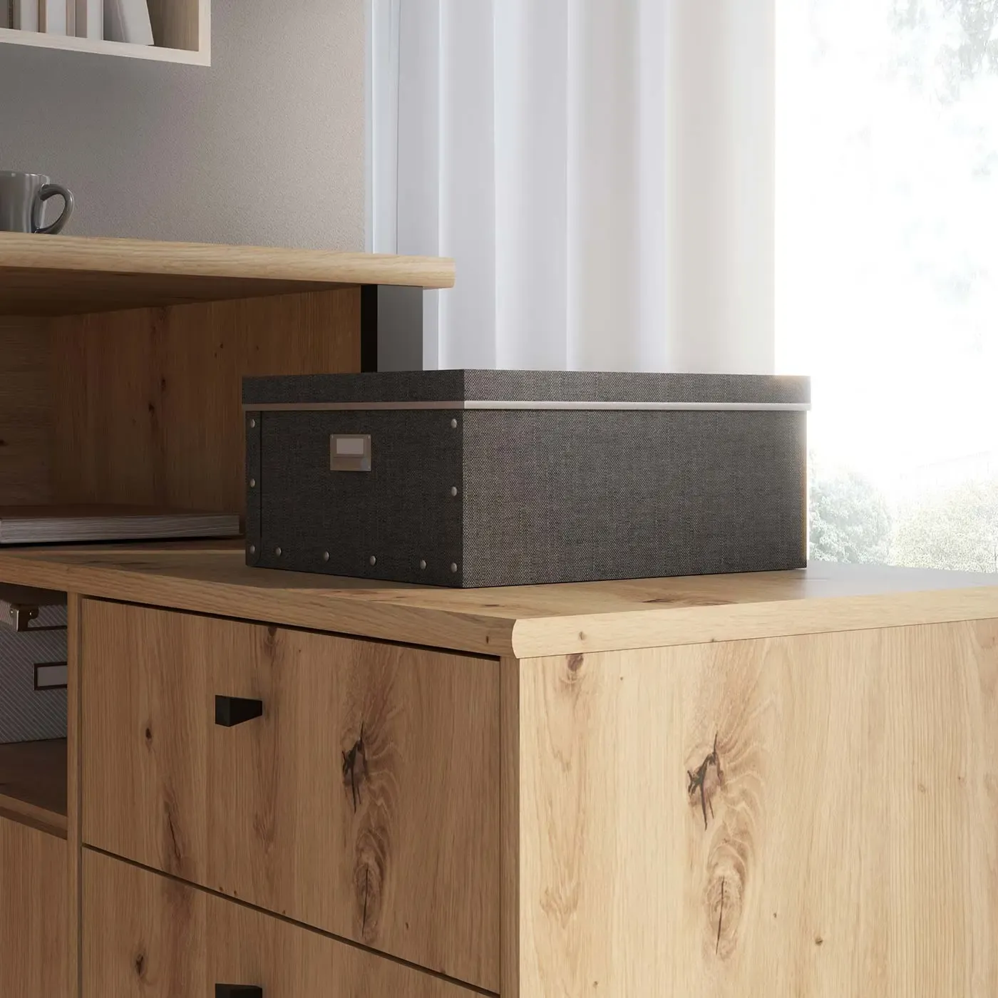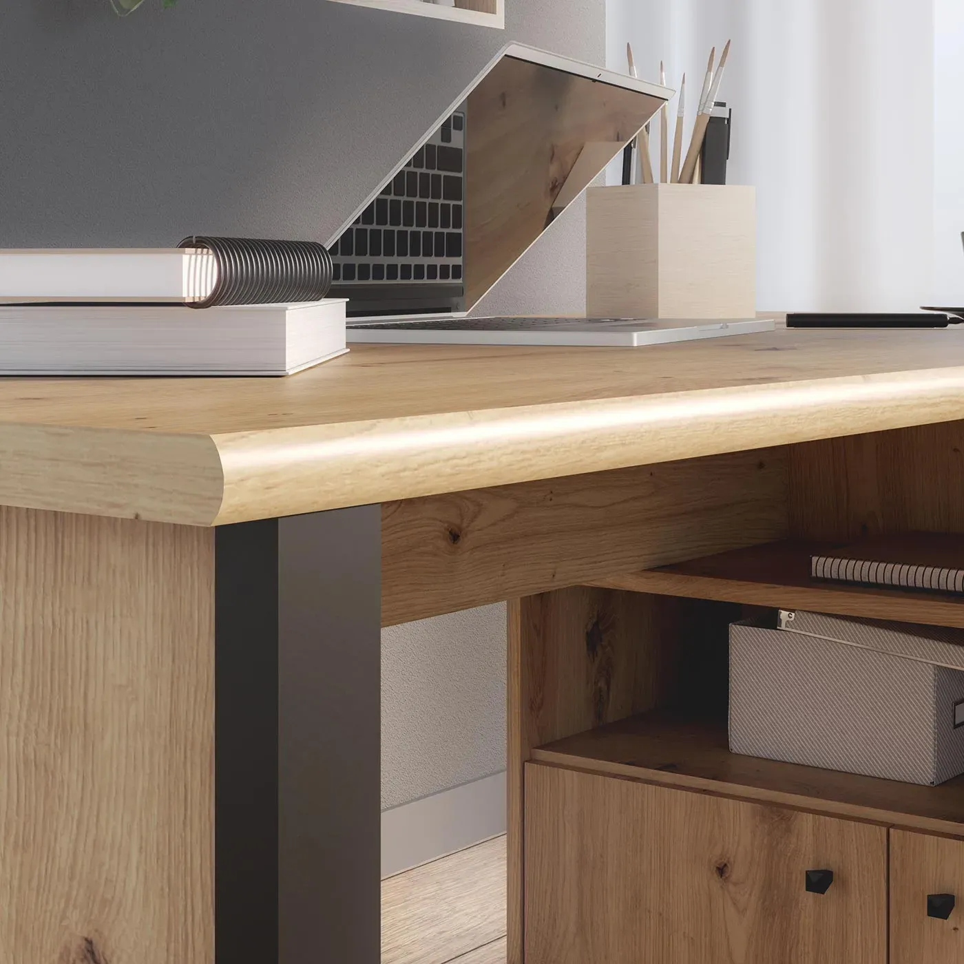 Questa scrivania è conosciuta per essere un pezzo unico nel suo genere: la funzionalità e la versatilità raggiungono qui vette mai toccate prima d'ora con l'efficiente dotazione di 3 cassetti, un vano a giorno e di 2 ante custodenti uno spazio interno, tutti utilizzabili a piacimento.