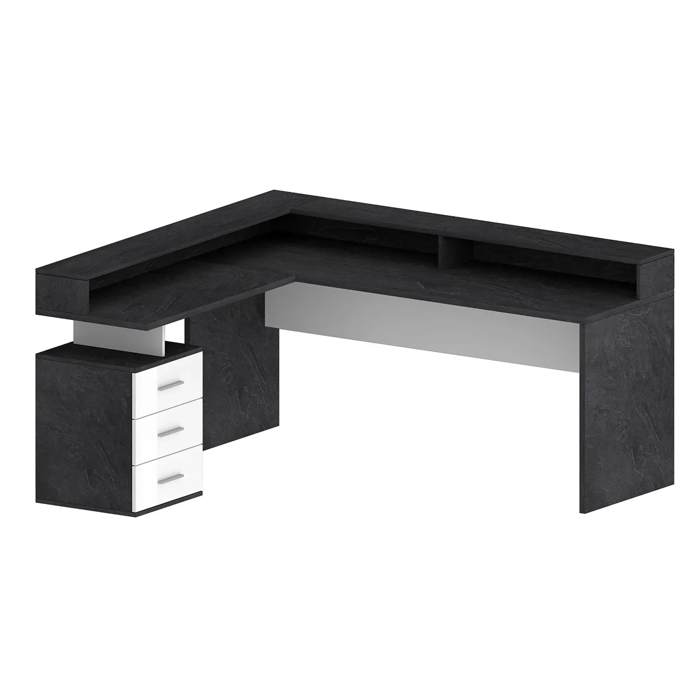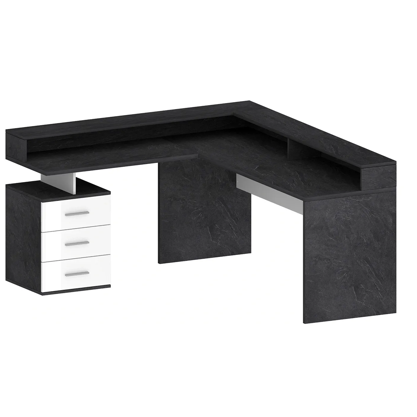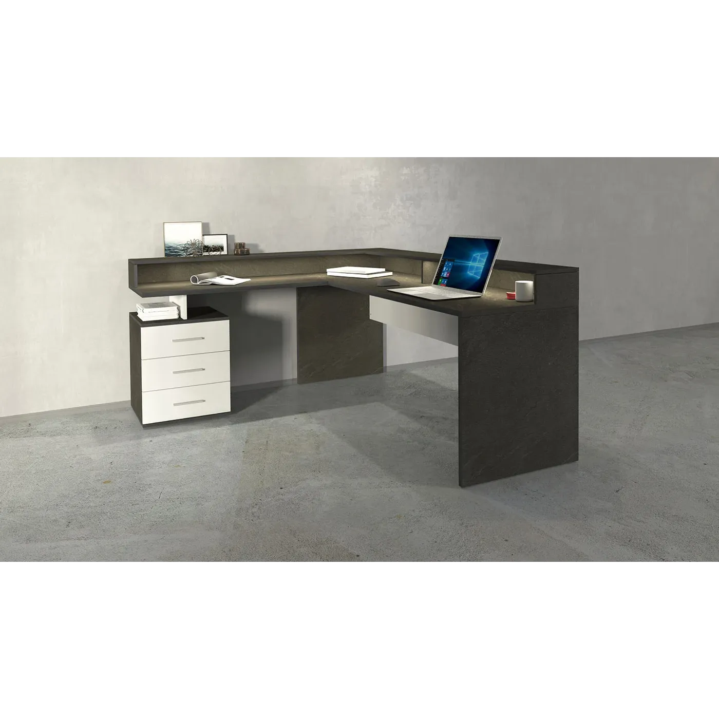 Scrivania angolare 3 cassetti, 180/160x90x60 h cm, Bianco laccato lucido e Ardesia