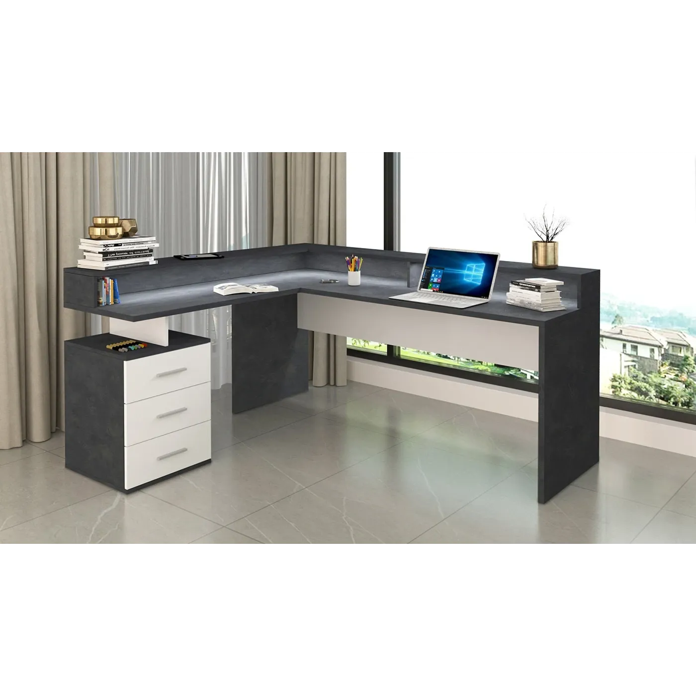 I 3 cassetti, dotati di guide in metallo, permettono di archiviare documenti, libri e fascicoli in modo ordinato e accessibile. Il sopralzo, inoltre, può ospitare anche una luce a LED, trasformando così la scrivania in una postazione da gaming. Il mobile è un’ottima soluzione per organizzare documenti e materiali di lavoro. La sua struttura angolare, inoltre, massimizza l'utilizzo dello spazio disponibile, consentendo così una disposizione flessibile e ergonomica.