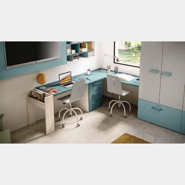 La scrivania è nata per offrire la giusta comodità durante le ore di studio, anche nelle camerette con dimensioni limitate. La scrivania angolare infatti ha una doppia postazione di lavoro, per renderla più funzionale sono stati aggiunti un fianco porta riviste ed una cassettiera a 3 cassetti.
