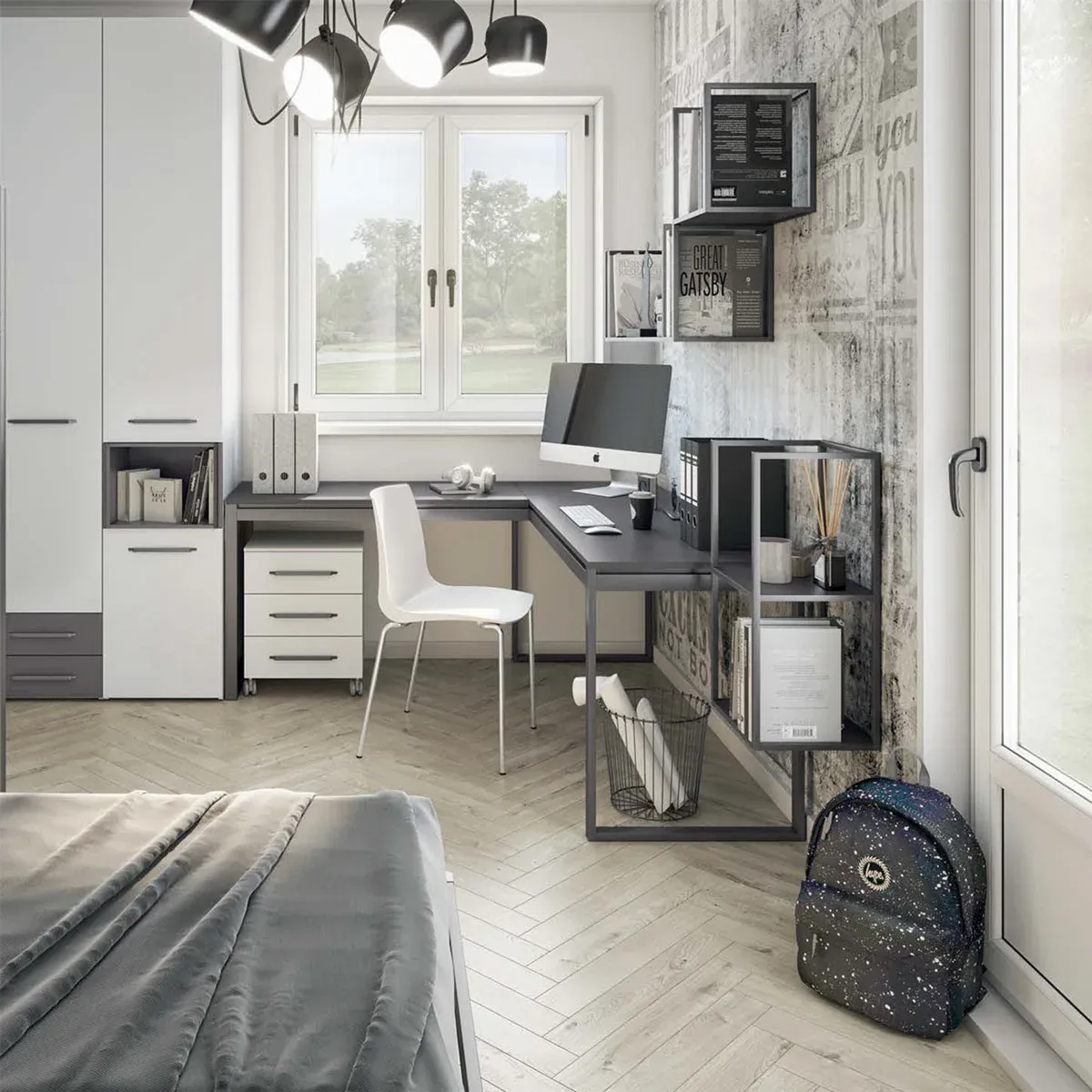 La scrivania angolare consente di sfuttare a pieno lo spazio nella cameretta, assicurando un piano di grande dimensioni in cui il ragazzo possa studiare in totale comodità.