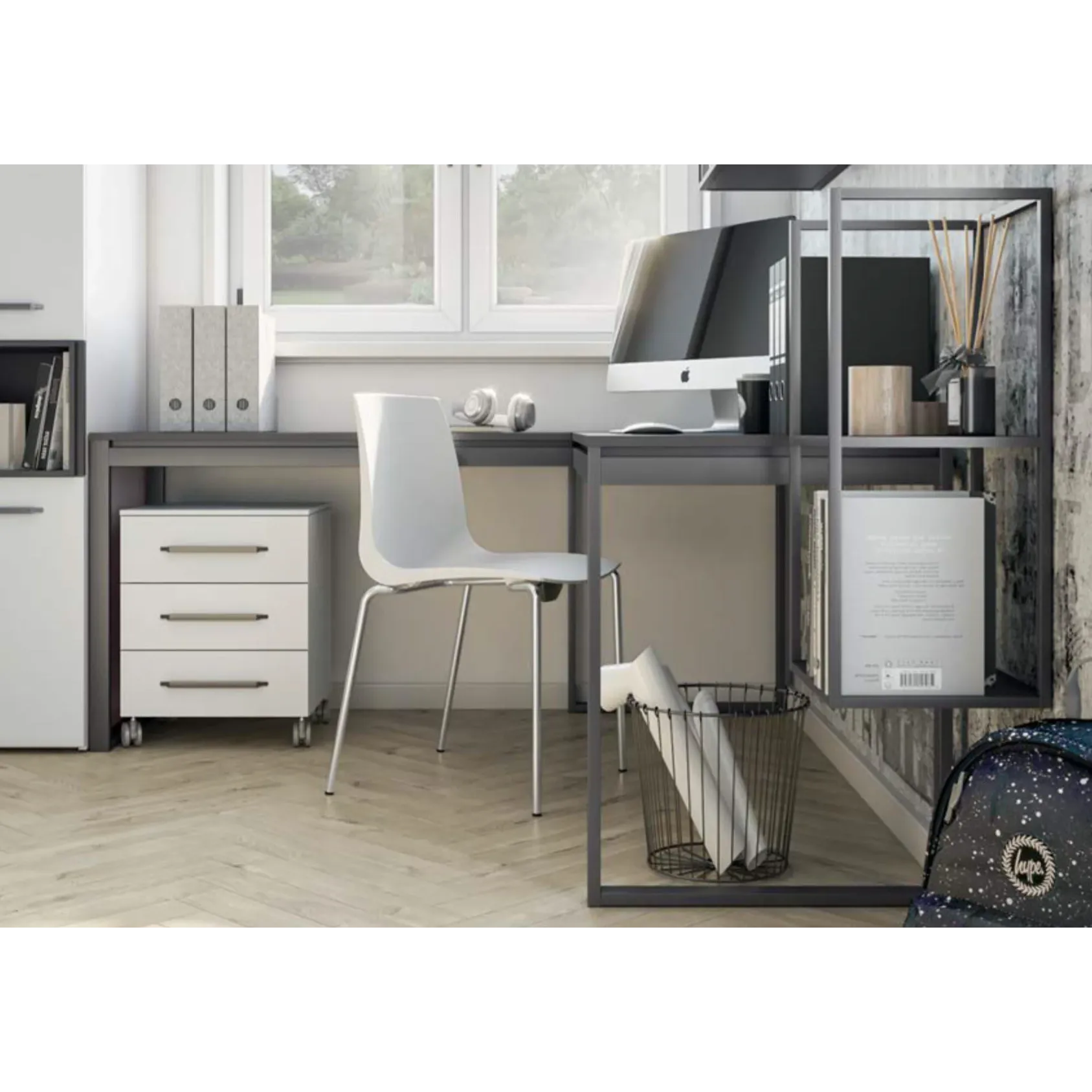 E' possibile attrezzare la scrivania con la cassettiera a 3 cassetti e le librerie System.