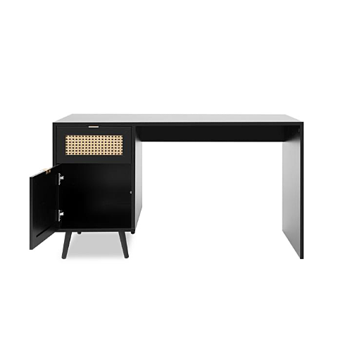 La scrivania è dotata di un ampio piano di appoggio per assicurare la massima praticità durante le ore di studio e lavoro. A completarla è la cassettiera con un cassetto ed un'anta in cui sono posti nei frontali dei pannelli con stampa in finitura Oro.