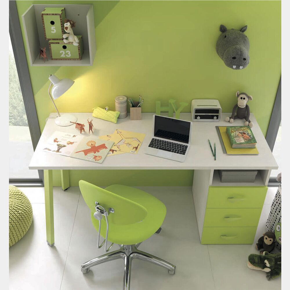 La scrivania è proposta in Betulla e Verde cedro. E' possibile modificare i colori scegliendo tra un'ampia gamma di finiture in essenza oppure colorate laccate per creare una composizione unica e perfettamente inserita nella tua cameretta. Come optional è possibile richiedere i pensili sospesi e la sedia con ruote.