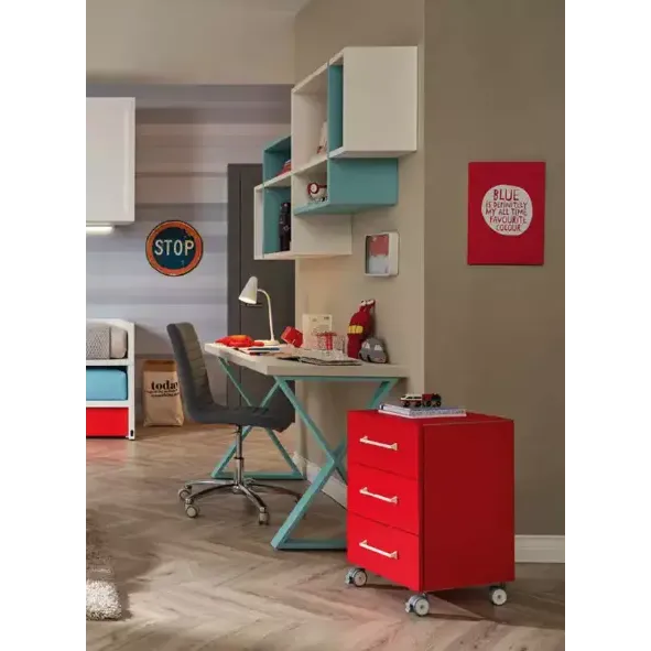 La scrivania presenta un ampio piano per consentire al ragazzo di avere tutto ciò che serve comodo, durante le ore di studio. Le gambe a "X" in metallo presentano una tinta moderna, il Cielo, mentre il piano è in Bianco luce.