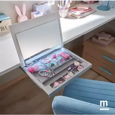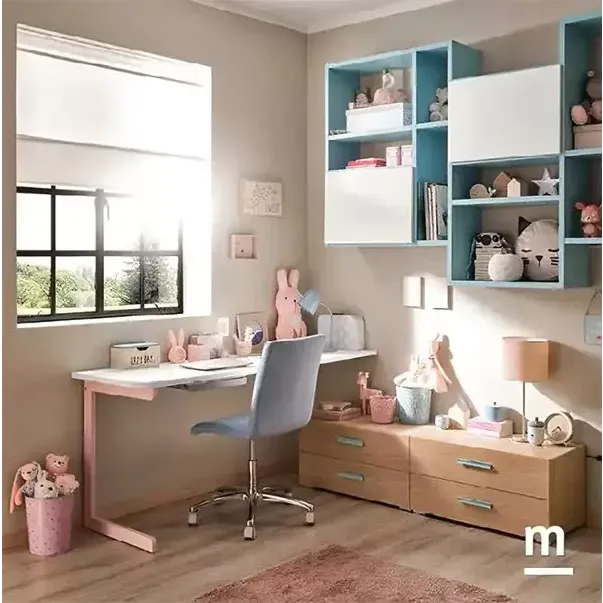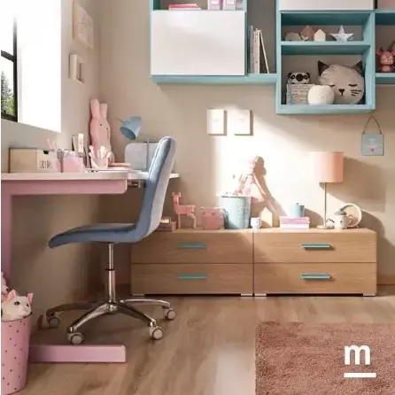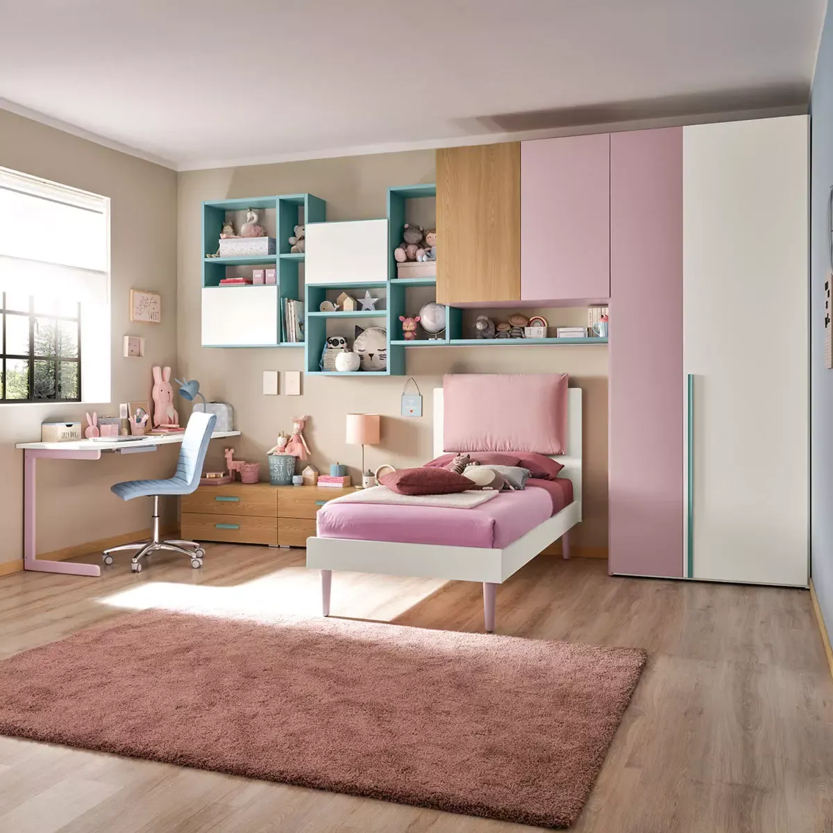 Quello che viene fuori è una postazione ideale per leggere e studiare. La grande scrivania (172.8 cm di larghezza) è fissata a parete sulla destra, mentre a sinistra è retta da un supporto a “c”. Lo spigolo del piano, verso il centro della stanza, è opportunamente arrotondato per garantire la massima sicurezza.