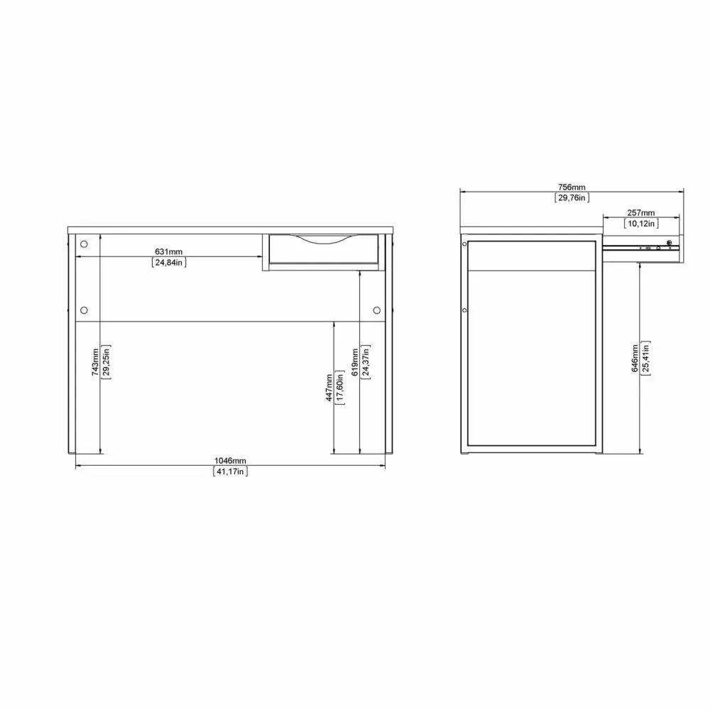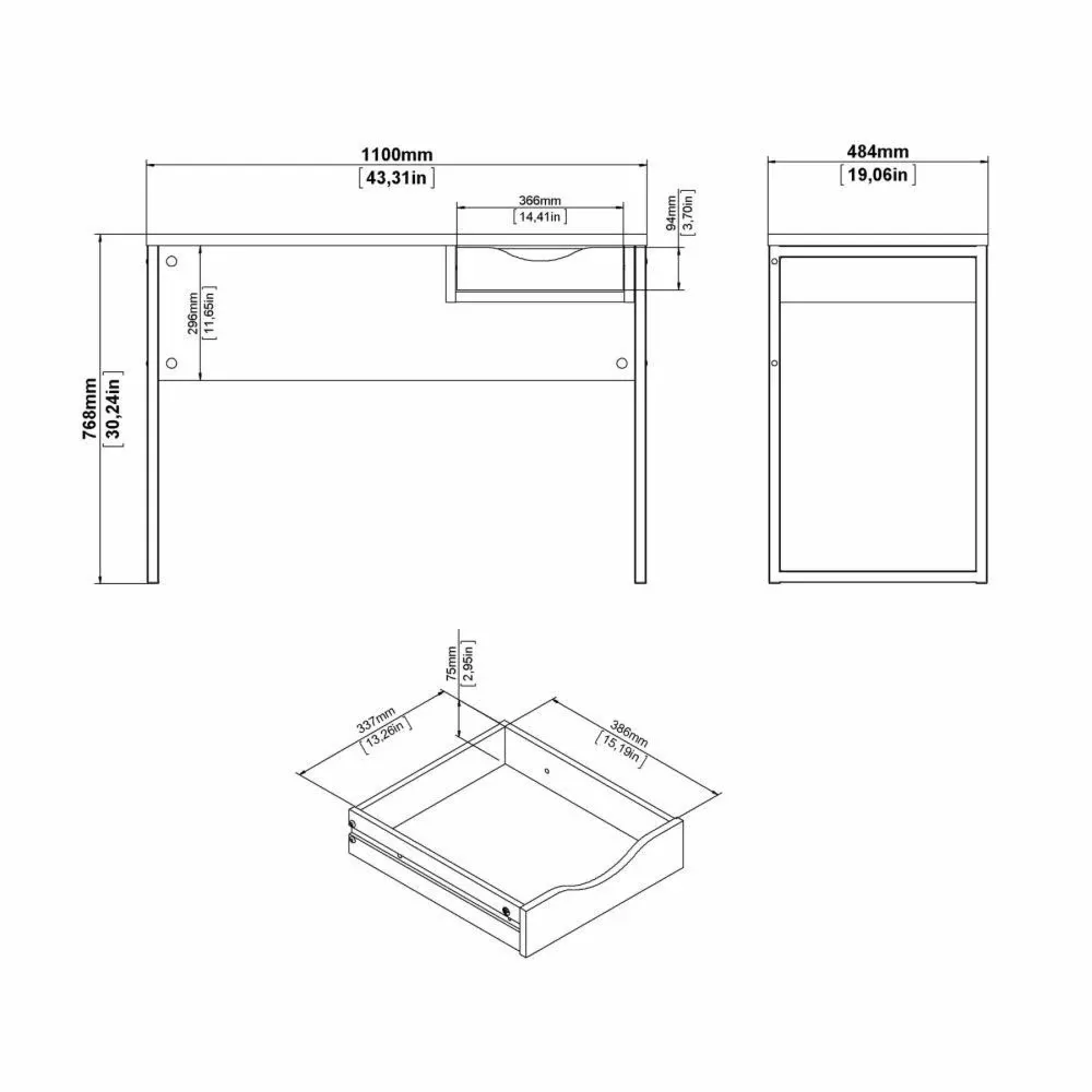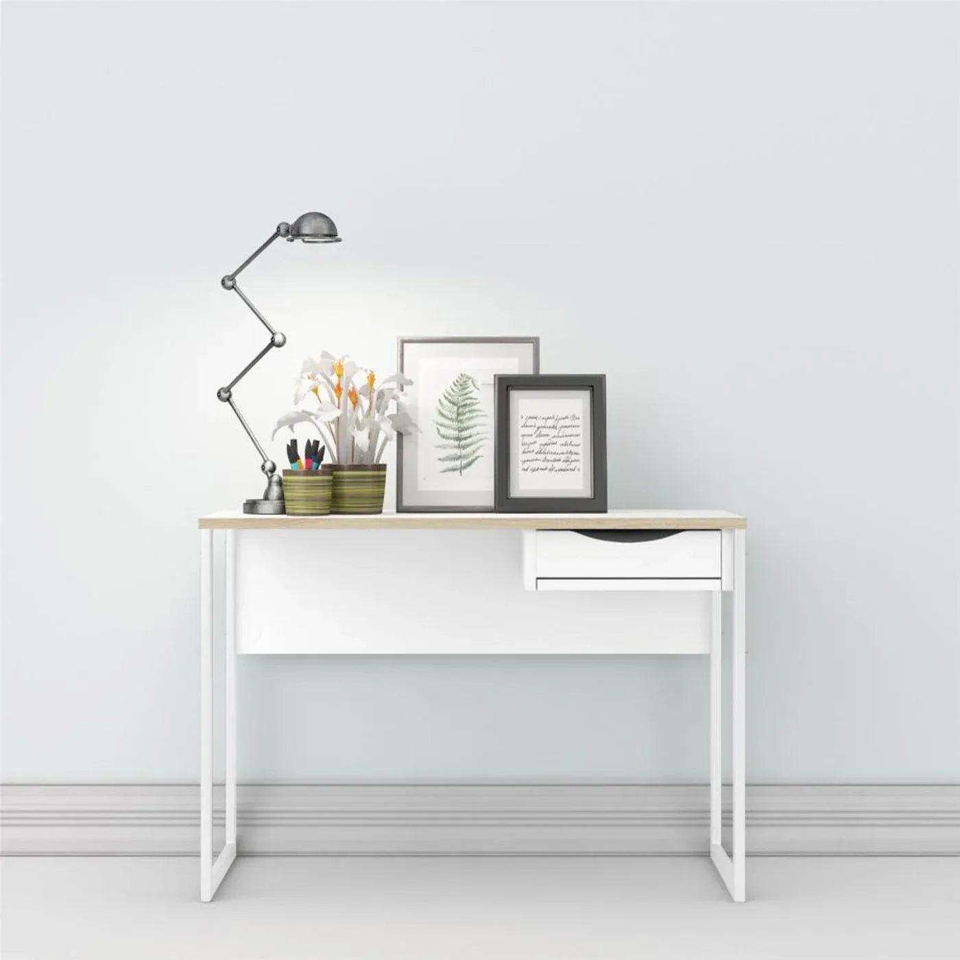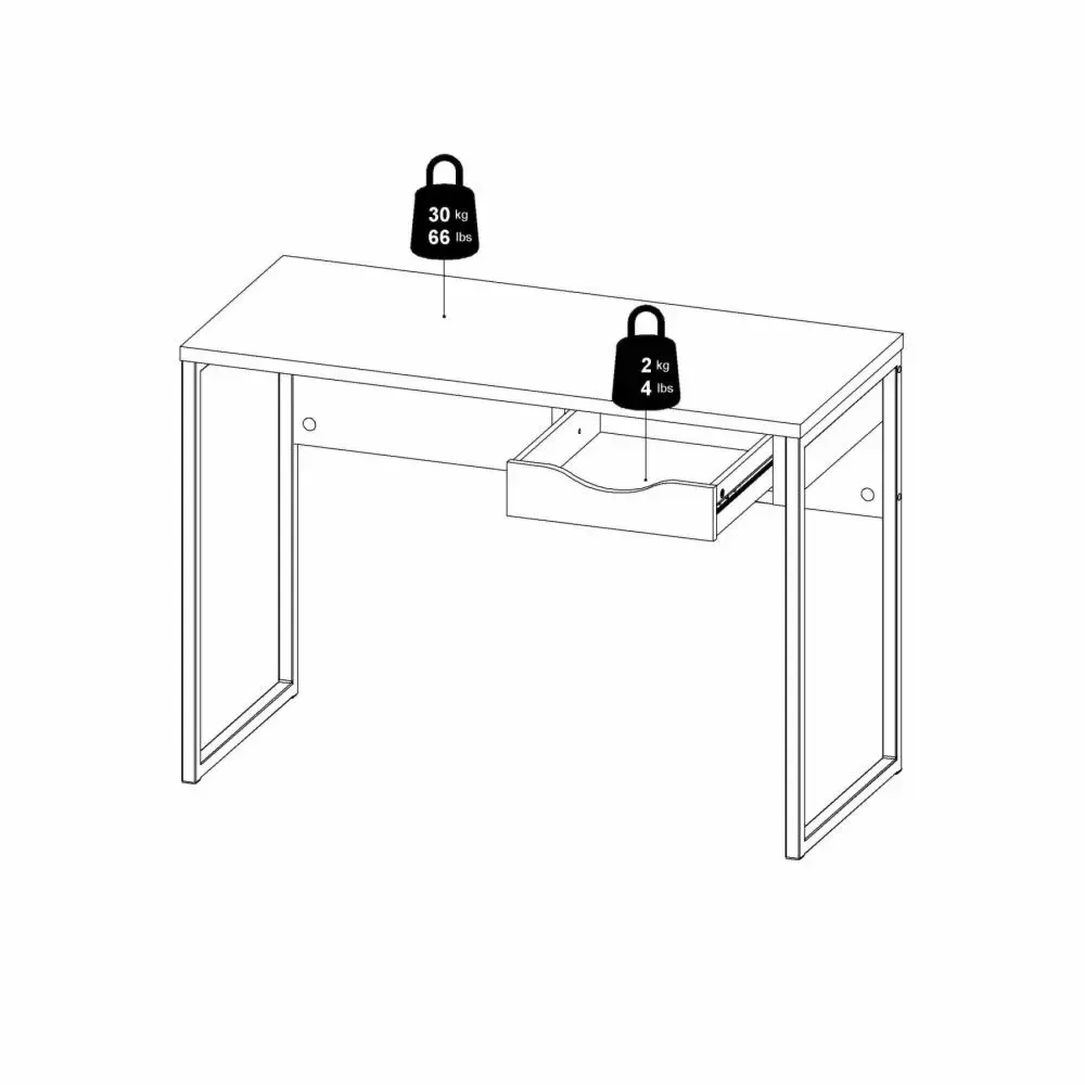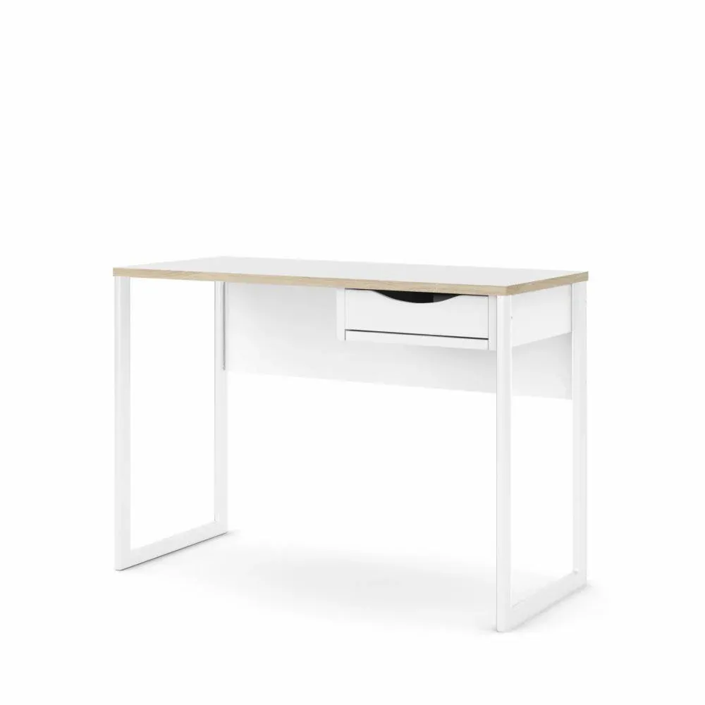 La scrivania è composta sta un cassetto nella parte superiore, da alte gambe in acciaio e da un grande panello. Grazie al moderno design della scrivania si può adattare a più ambienti come in ufficio, in una cameretta o in una camera da letto. La scrivania è anche disponibile in versione Nero opaco.