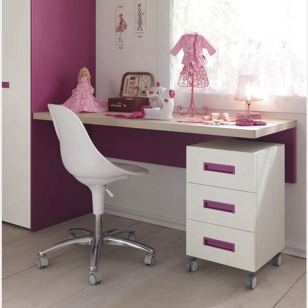La scrivania presenta tutti gli spigoli arrotondati, progettati per garantire sicurezza al 100%. Lo spessore del piano è di 40 mm. Le finiture possono essere personalizzate optando per colori neutri oppure accesi, laccati oppure nobilitati. I colori proposti in foto sono Larice e Ciclamino.