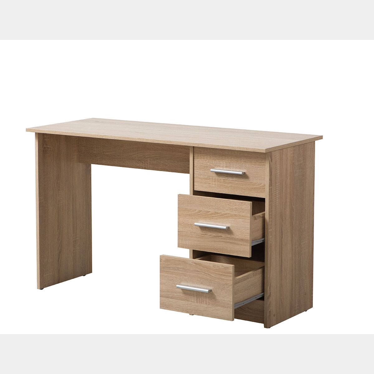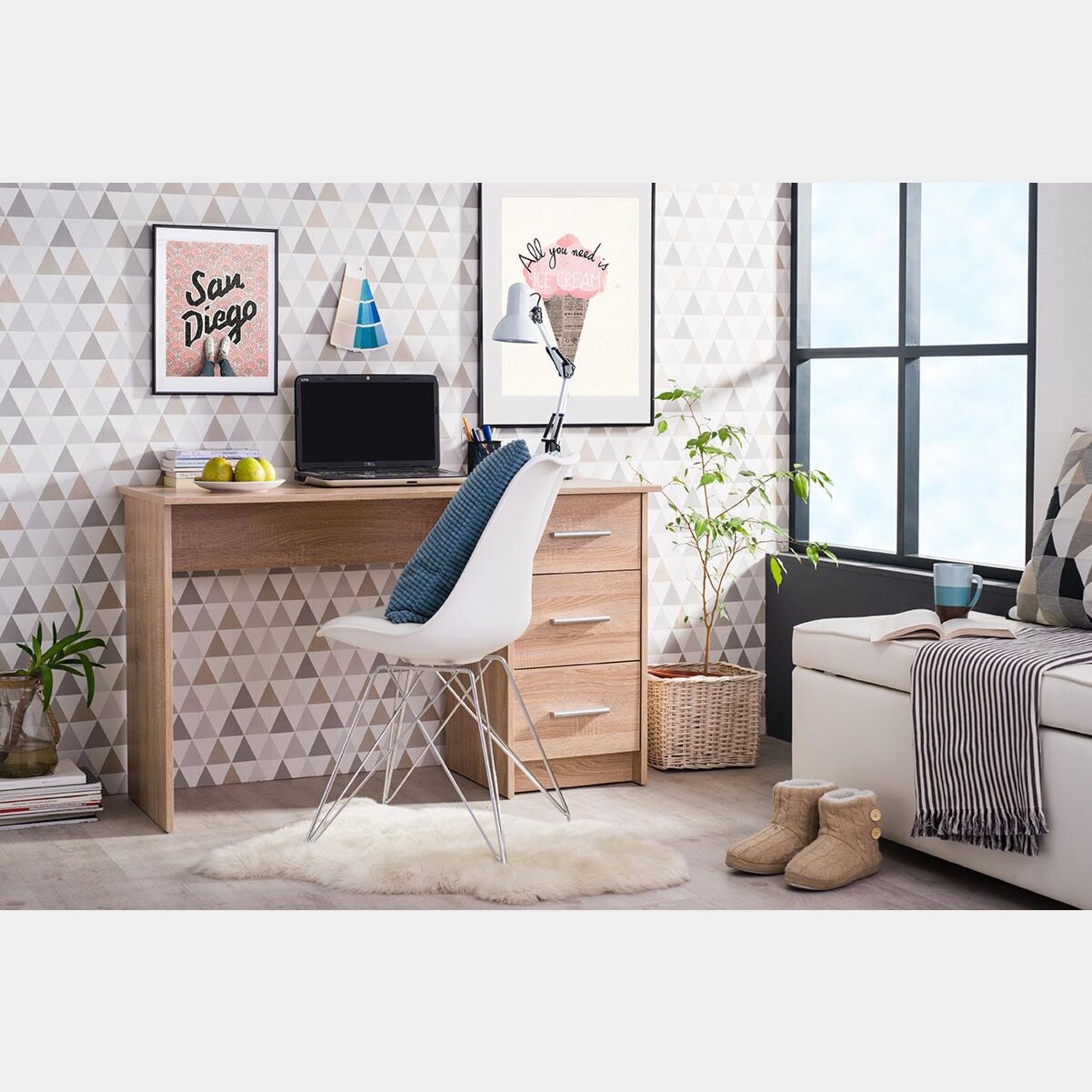 La finitura Rovere presenta sfumature irregolari che contribuiscono a rendere caldo e accogliente l'ambiente, inotre le maniglie dei cassetti di colore grigio valorizzano il design della scrivania, rendendola elegante e moderna.