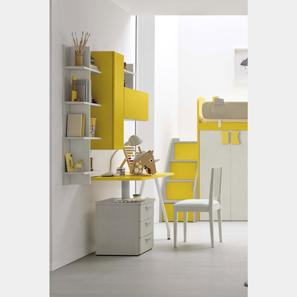 Le finitura proposte in Rovere dorian e Giallo zafferano possono essere sostituite optando per altre finiture materiche oppure colorate, per questo la scrivania si adattarà perfettamente alla tua cameretta.