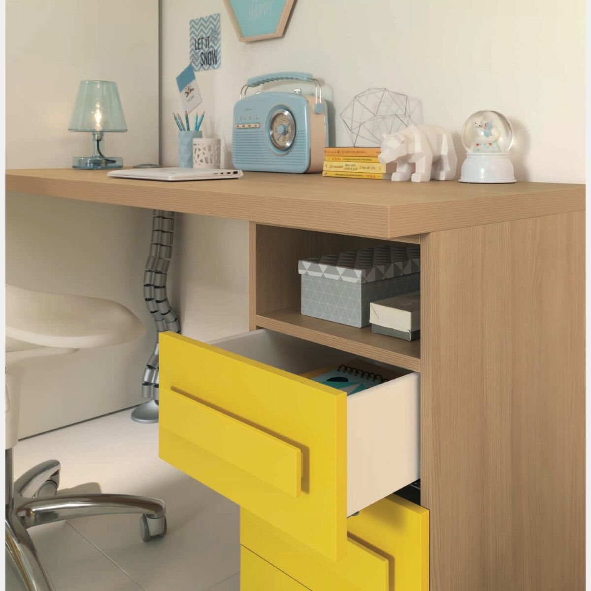 La scrivania è proposta in Olmo e Senape. E' possibile modificare i colori scegliendo tra un'ampia gamma di finiture in essenza oppure colorate laccate per creare una composizione unica e perfettamente inserita nella tua cameretta.