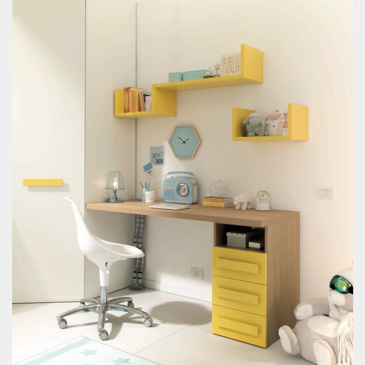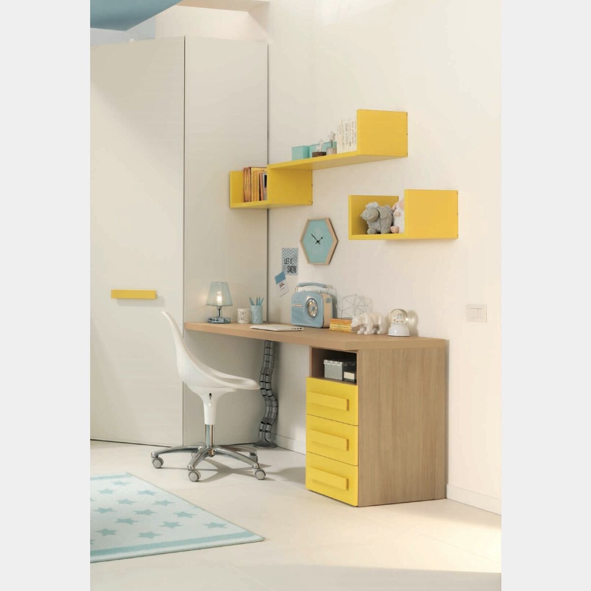 Sinergia di forme e cromatismi in camera. Design, colori e materiali son combinati sapientemente per diffondere energia contagiosa. La zona studio è composta da una scrivania in essenza olmo con piano (Sp.40mm) che poggia su una cassettiera con tre cassetti e vano a giorno passante.