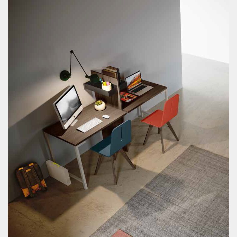 La zona studio ha una doppia postazione pensata per assicurare una totale comodità durante lo studio. I due piani da 90 cm sono divisi da un pannello centrale per garantire la massima concentrazione. E' possibile richiedere come optional il porta oggetti in metallo e le sedie.