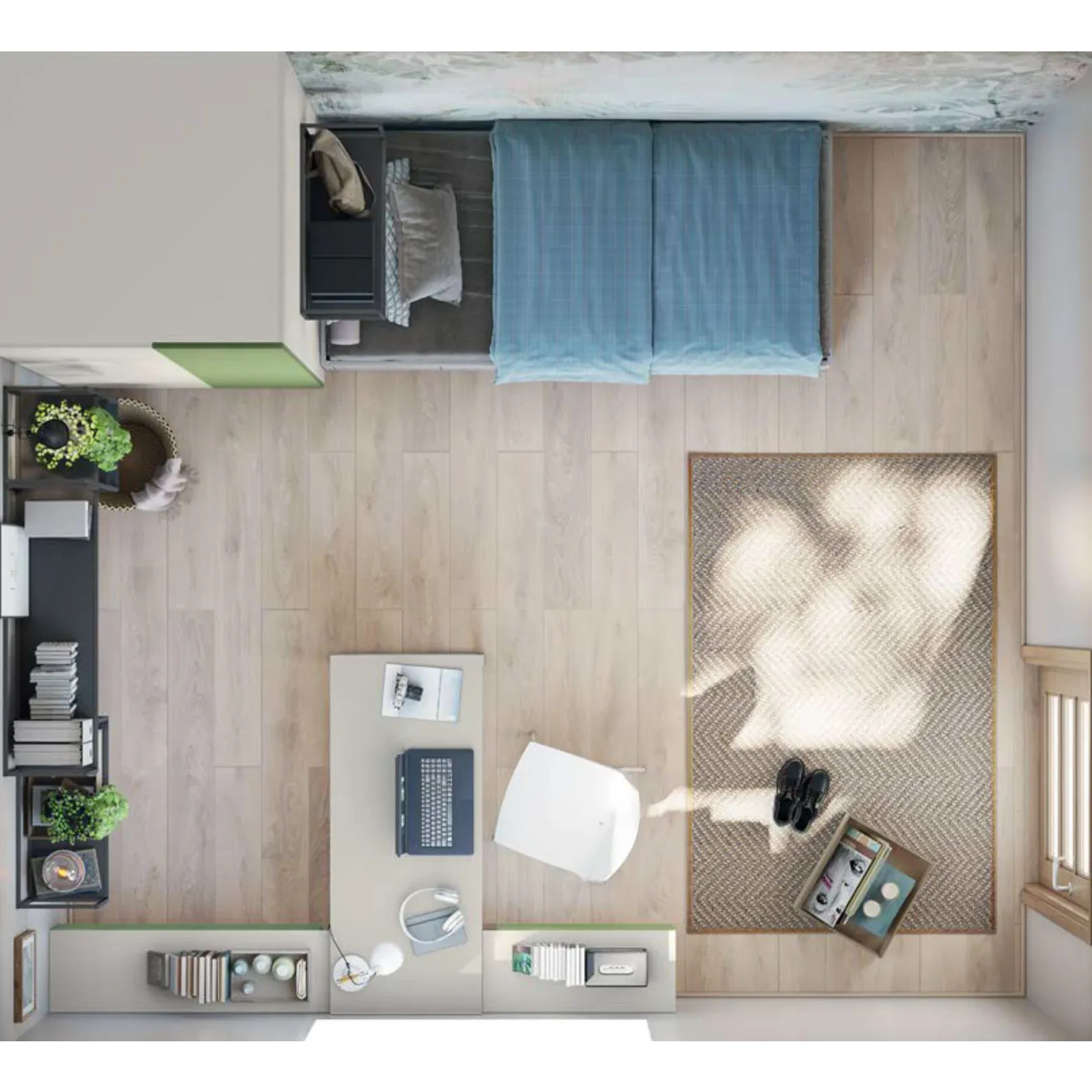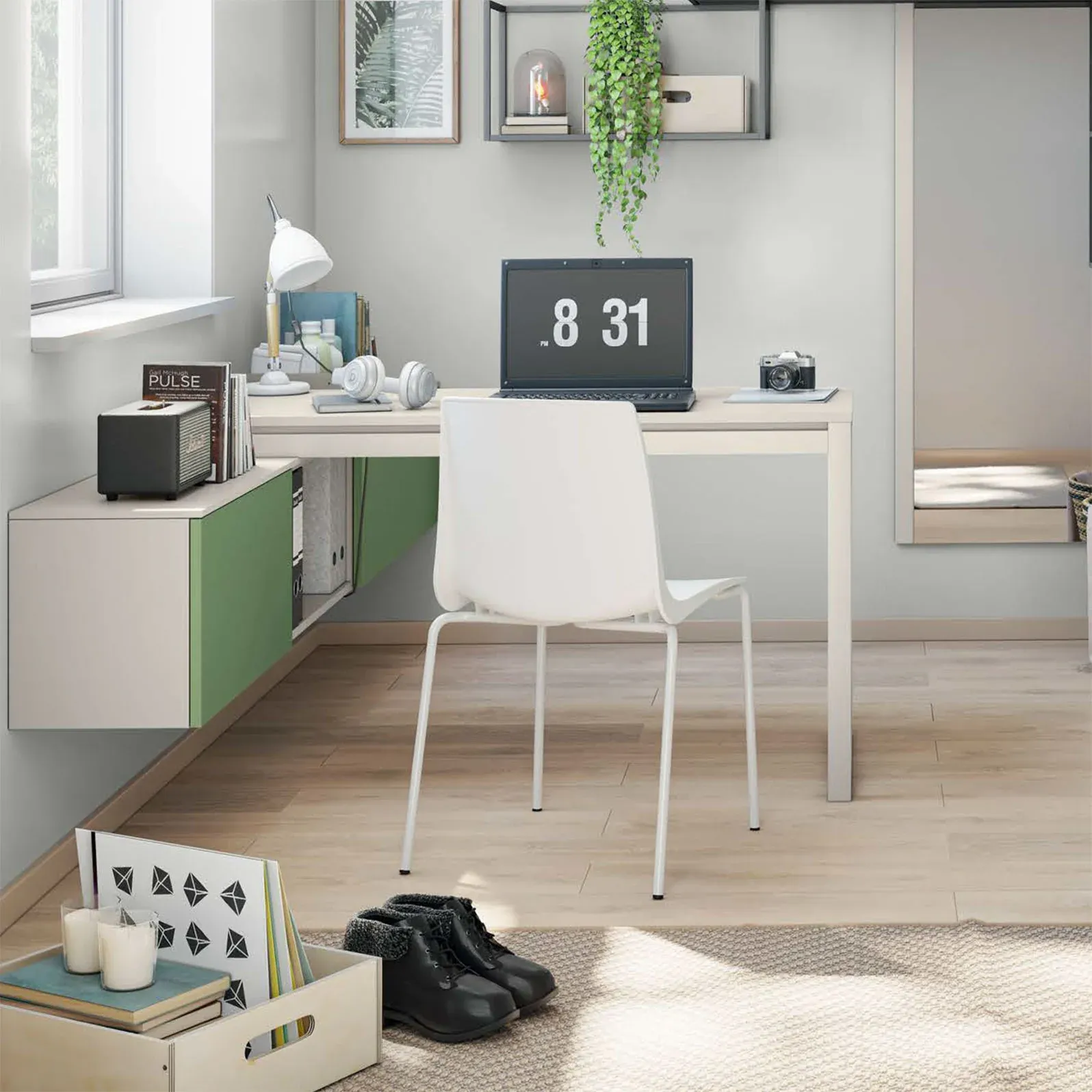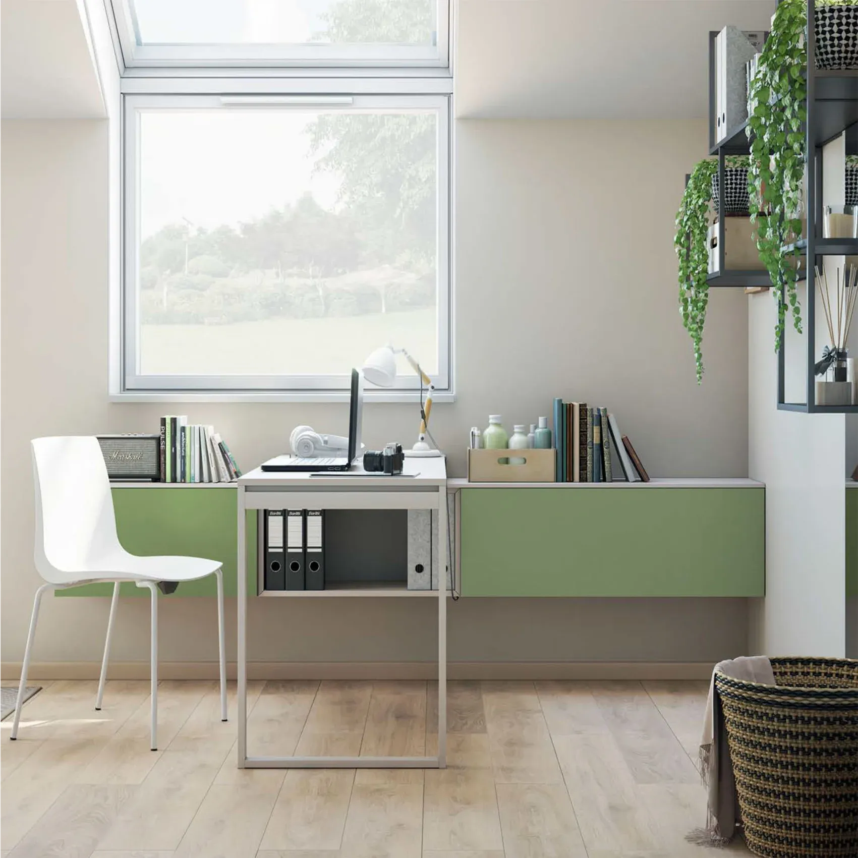 Le finiture Quarzo e Verde oliva possono essere personalizzate secondo i propri gusti per ottenere una zona studio che ben si adatti alla propria cameretta.