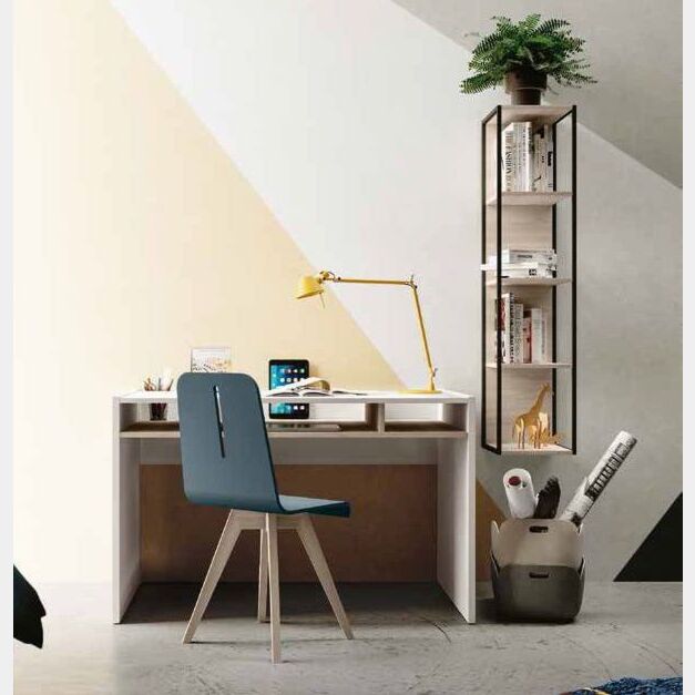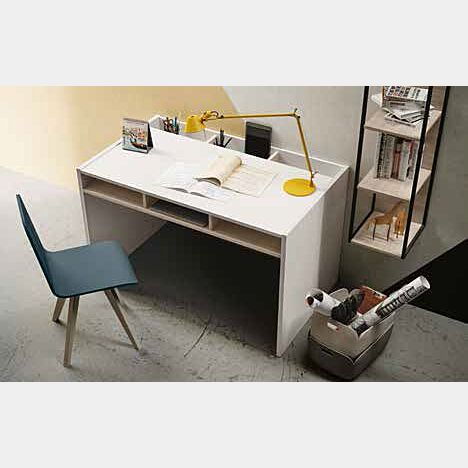 La scrivania è dotata di un piano estraibile per ottenere un ulteriore spazio sottostante. I tre vani a giorno hanno dimensioni 38,8x10x12,5 cm. Lo spessore di piano e fianchi è di 2,5 cm. Prodotta con pannelli a bassa emissione di formaldeide, certificati E1.