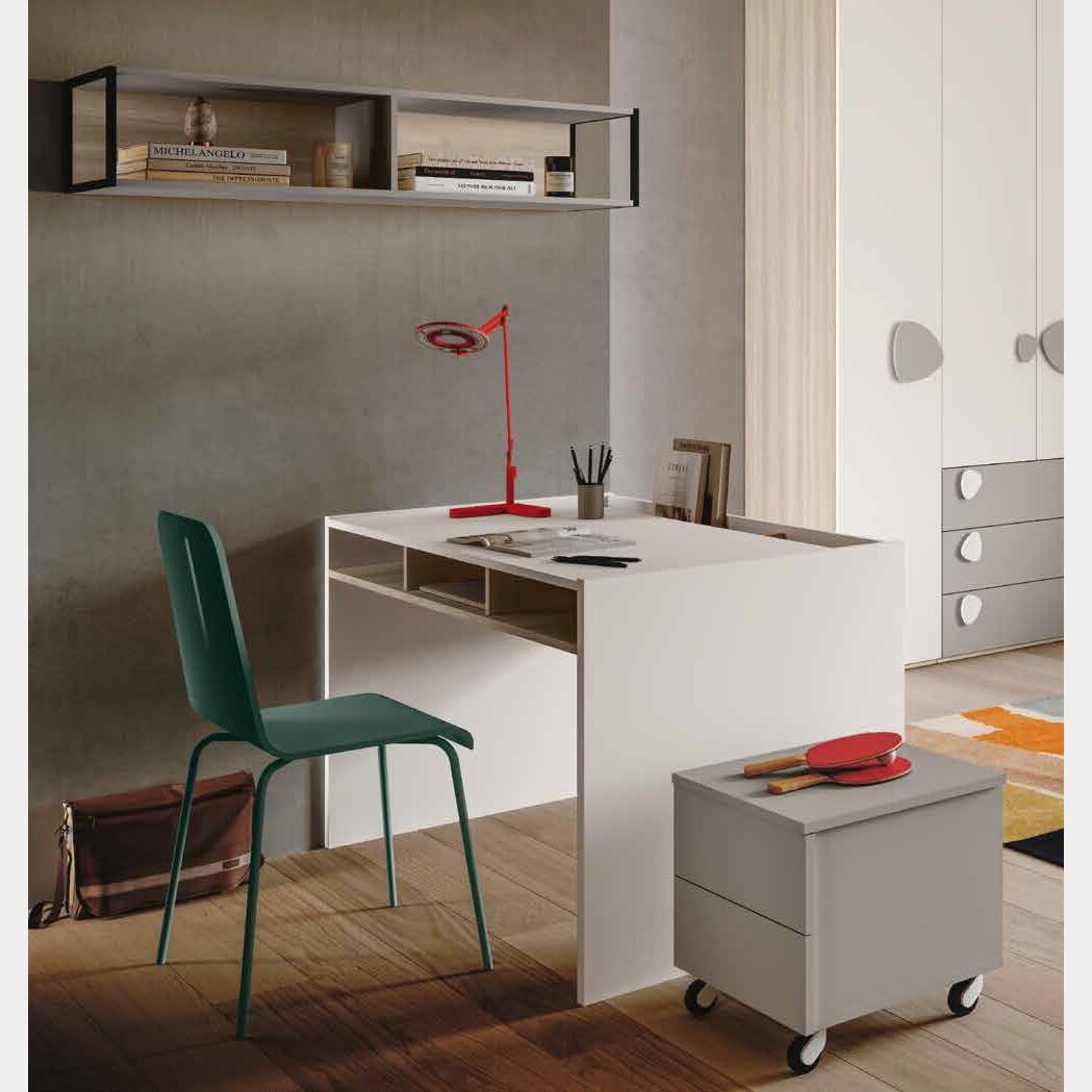 La scrivania presenta un design moderno e divertente: il piano scorrevole nasconde 3 vani per riporre oggetti ed avere tutto a portata di mano. L'ampia profondità di 75 cm assicura una totale comodità durante le ore di studio, garantendo ampi movimenti ed un ambiente di lavoro sempre ordinato.