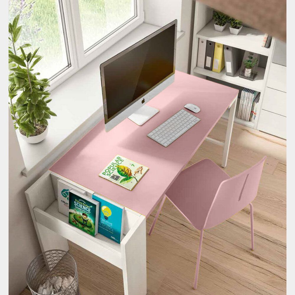 Scrivania con contenitore, Gialla grano e Larice Bianco. La moderna scrivania della collezione POP è disponibile nelle finiture Essenze e Colorati e piano e gambe possono essere scelti tra diversi colori, in questo caso ha il top / piana Rosa confetto e gambe larice bianco e bianco laccato.