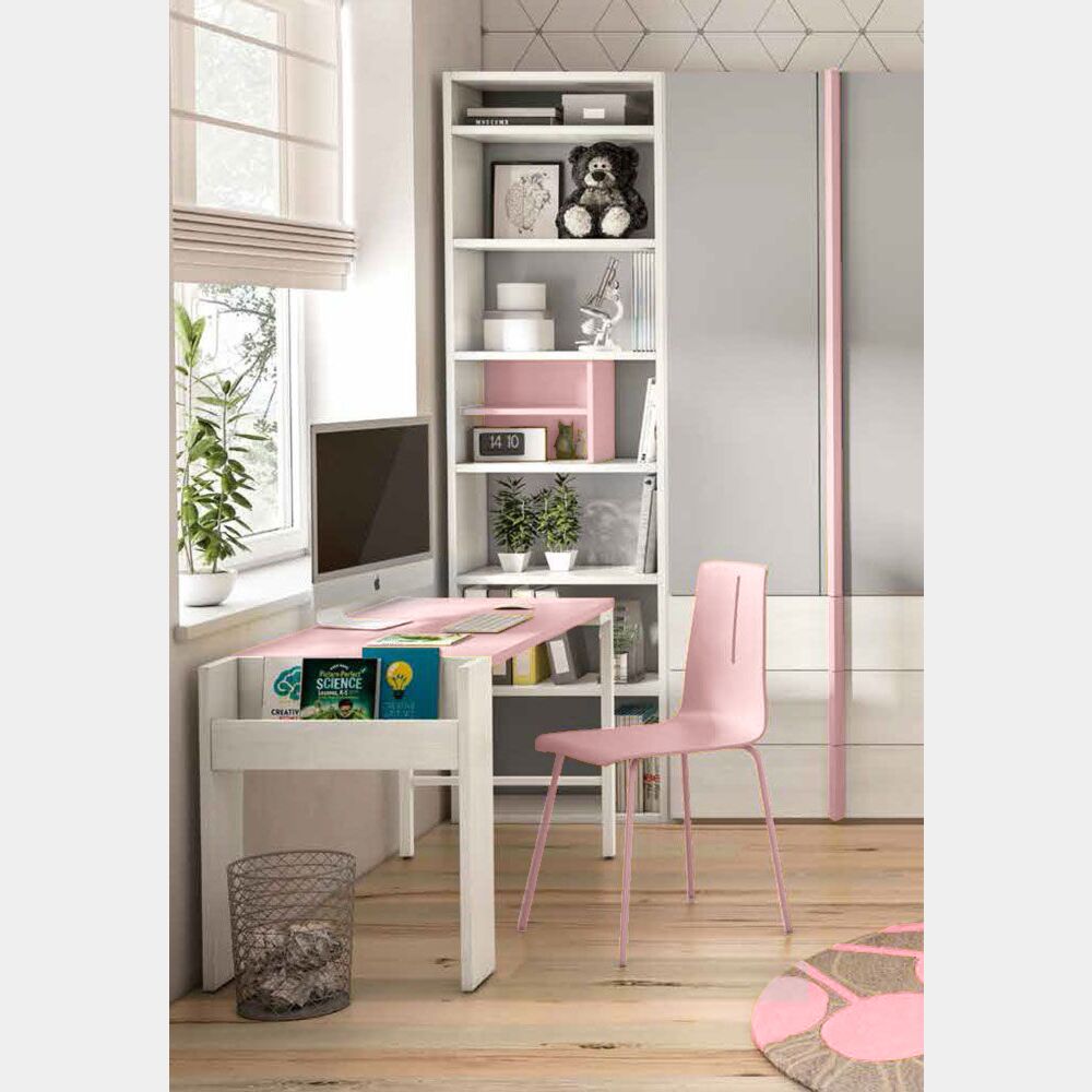 La particolarità di questa scrivania sta nelle gambe a destra con telaio in metallo colore bianco, mentre le gambe a sinistra sono in legno con finitura larice bianco. Le gambe a sinistra hanno anche un portariviste. Nella scrivania per camerette per ragazzi si può scegliere come optional la sedia come in foto oppure un foro passacavi per tenere ordinata la scrivania e appoggiarla al muro.
