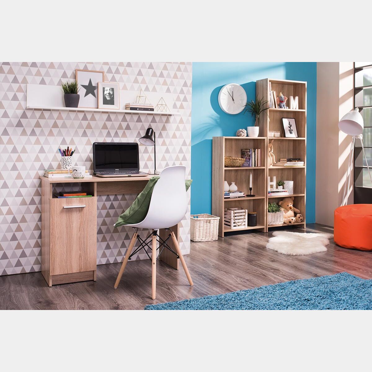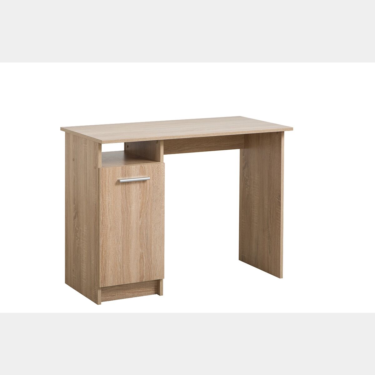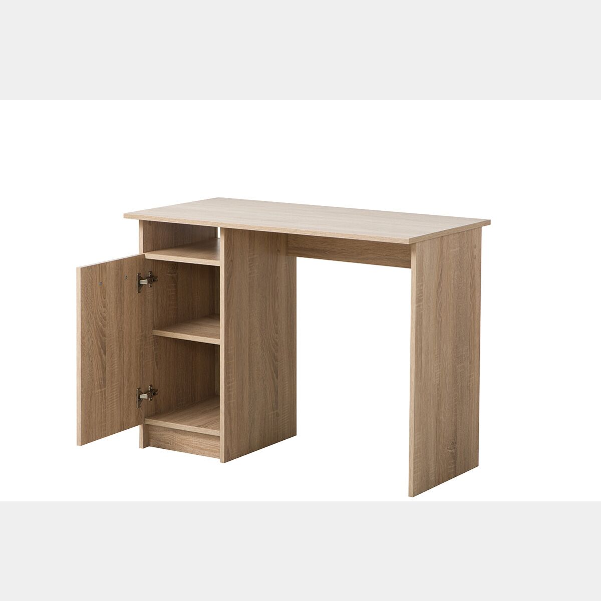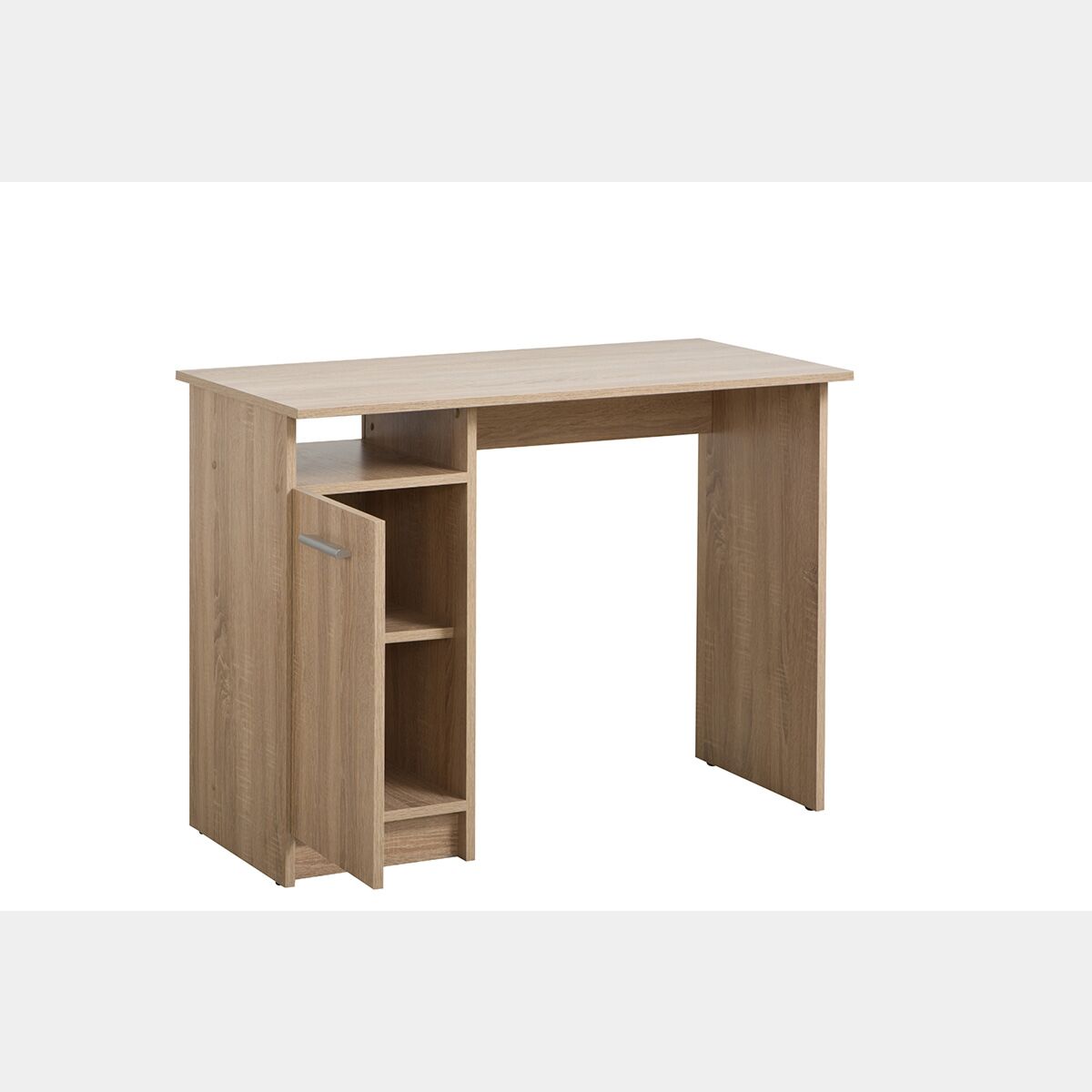 La scrivania presenta un design semplice e tradizionale, valorizzato da una calda finitura Rovere che, grazie alle sfumature create dalle venature, rende piano, fianchi e frontali con punti luce diversi. La scrivania ha un ampio piano per consentire comodi movimenti, nella sinistra si trova un'anta con ripiano interno che crea due vani a giorno, indispendabili per posizionare libri, documenti, cartelle e cancelleria.