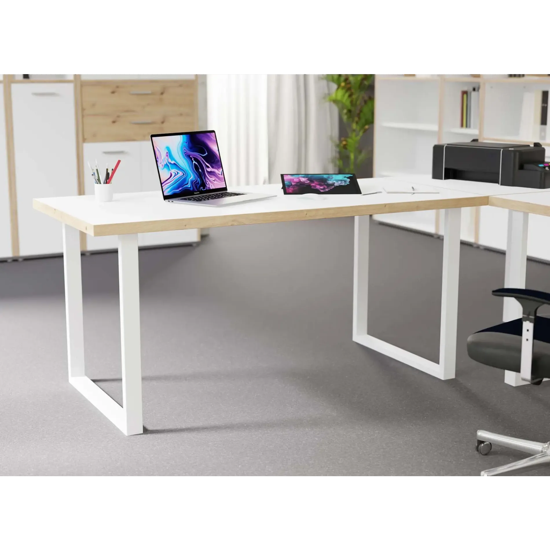 Scrivania da ufficio di ineguagliata versatilità grazie all'ampio piano di lavoro che offre e alla solidità conferitagli dalle ambe in metallo. Non delude le aspettative nemmeno dal punto di vista estetico grazie all'accostamento del Bianco e Rovere artisan, pur se a prevalere sia il primo.
