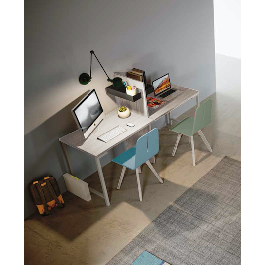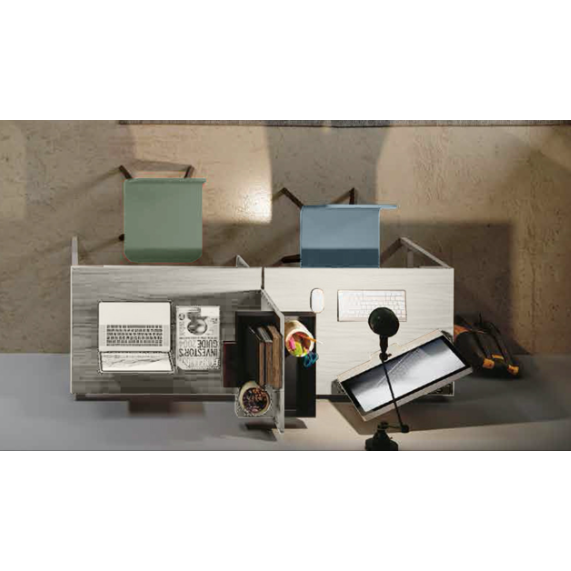 La zona studio ha una doppia postazione pensata per assicurare una totale comodità durante lo studio. I due piani da 90 cm sono divisi da un pannello centrale per garantire la massima concentrazione. E' possibile richiedere come optional il porta oggetti in metallo e le sedie.