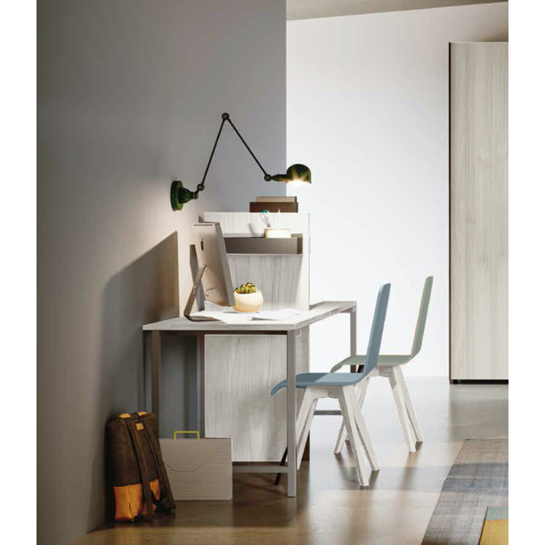 La scrivania viene proposta nella finitura in Bianco altea, le sue venature assicurano un arredo elegante e tradizionale, adattabile a tutte le camerette. E' possibile modificare le finiture scegliendo tra un'ampia gamma di colori per adattare la zona studio ai propri gusti e alla propria cameretta.