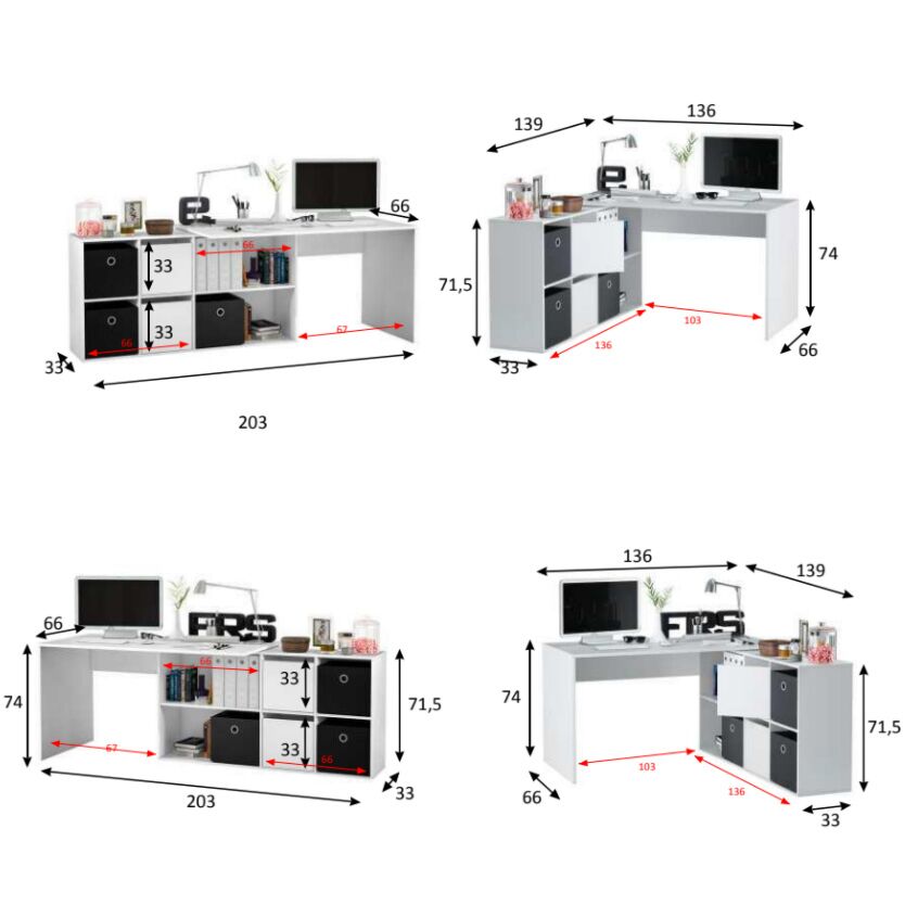 · Scrivania allungata: 74 cm (altezza) x 203 cm (larghezza) x 66 cm (prof.)