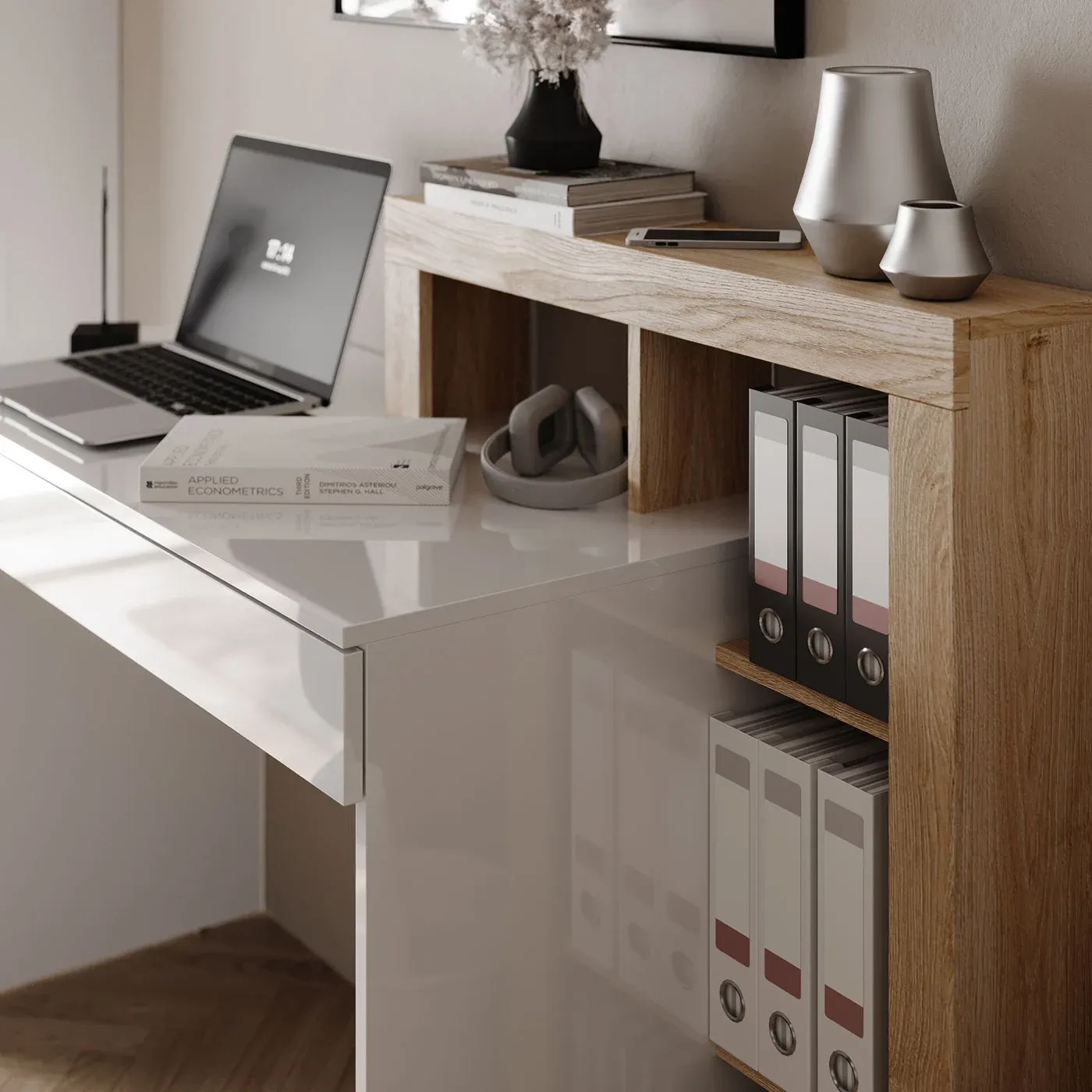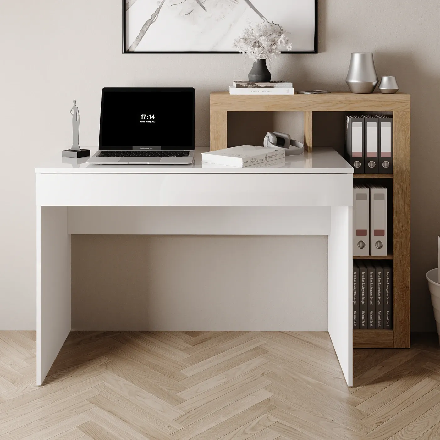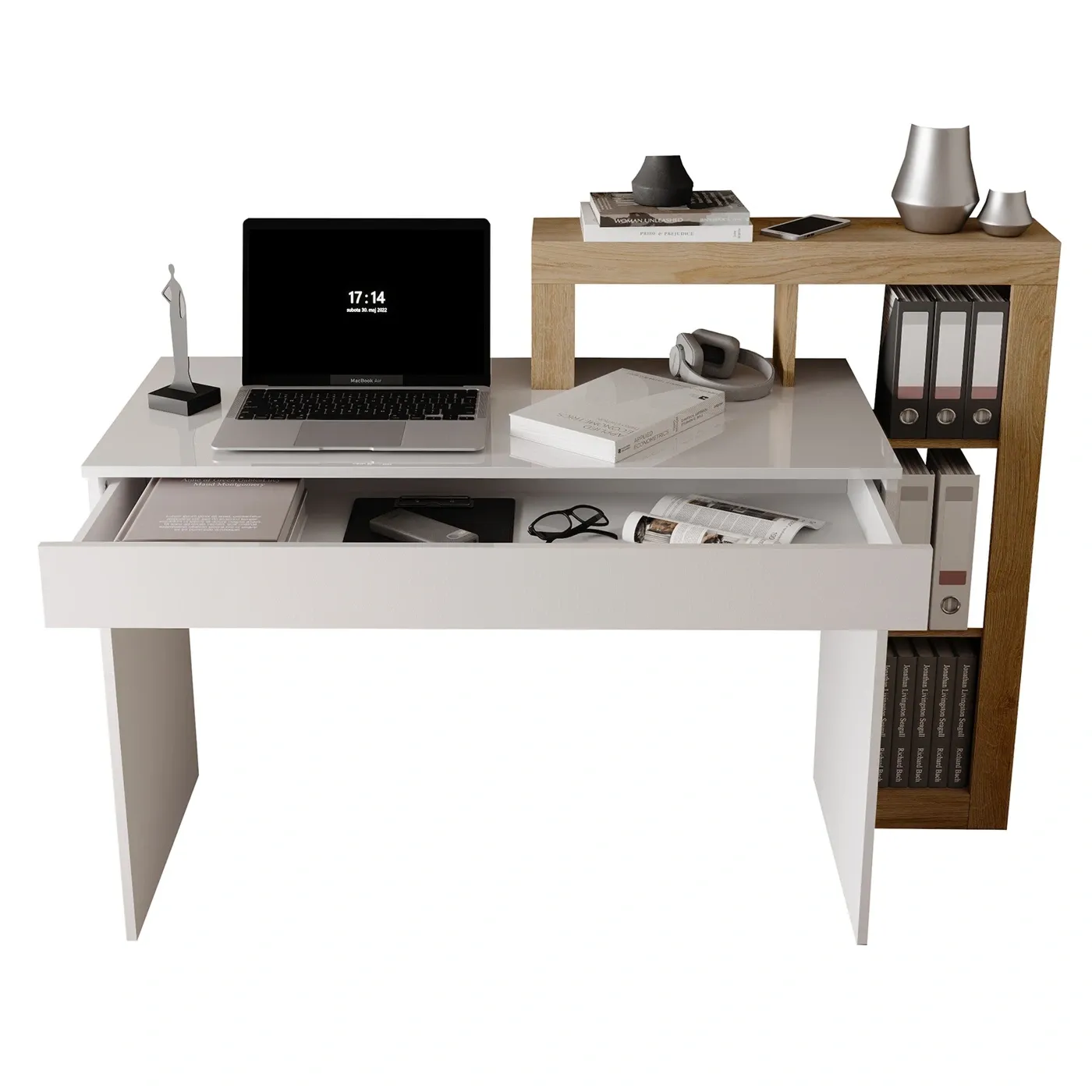 La scrivania e il cassetto sono in color Bianco lucido mentre la restante parte è in Cadiz e propone 2 ripiani, uno dei quali forma un vano a giorno con il resto della struttura esterna. Infine accanto a questo è presente un secondo vano a giorno contenitore.