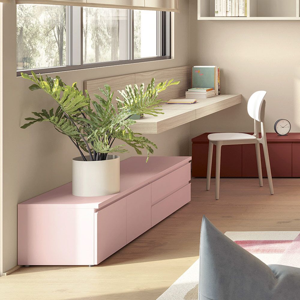 Zona studio per bambini e ragazzi moderna ed elegante composta da una scrivania sospesa ed una base a terra con due ante e due cassetti.